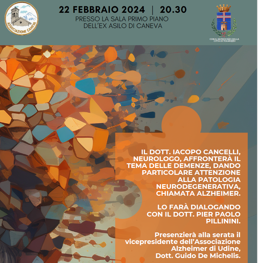 Si informa che L'Associazione Caneva ha organizzato per il giorno giovedì 22 febbraio 2024 ore 20.30 in Caneva di Tolmezzo l'evento dal titolo LUCE SULLA MEMORIA: CONOSCERE ED AFFRONTARE INSIEME LE DEMENZE, patrocinato dal Comune di Tolmezzo.