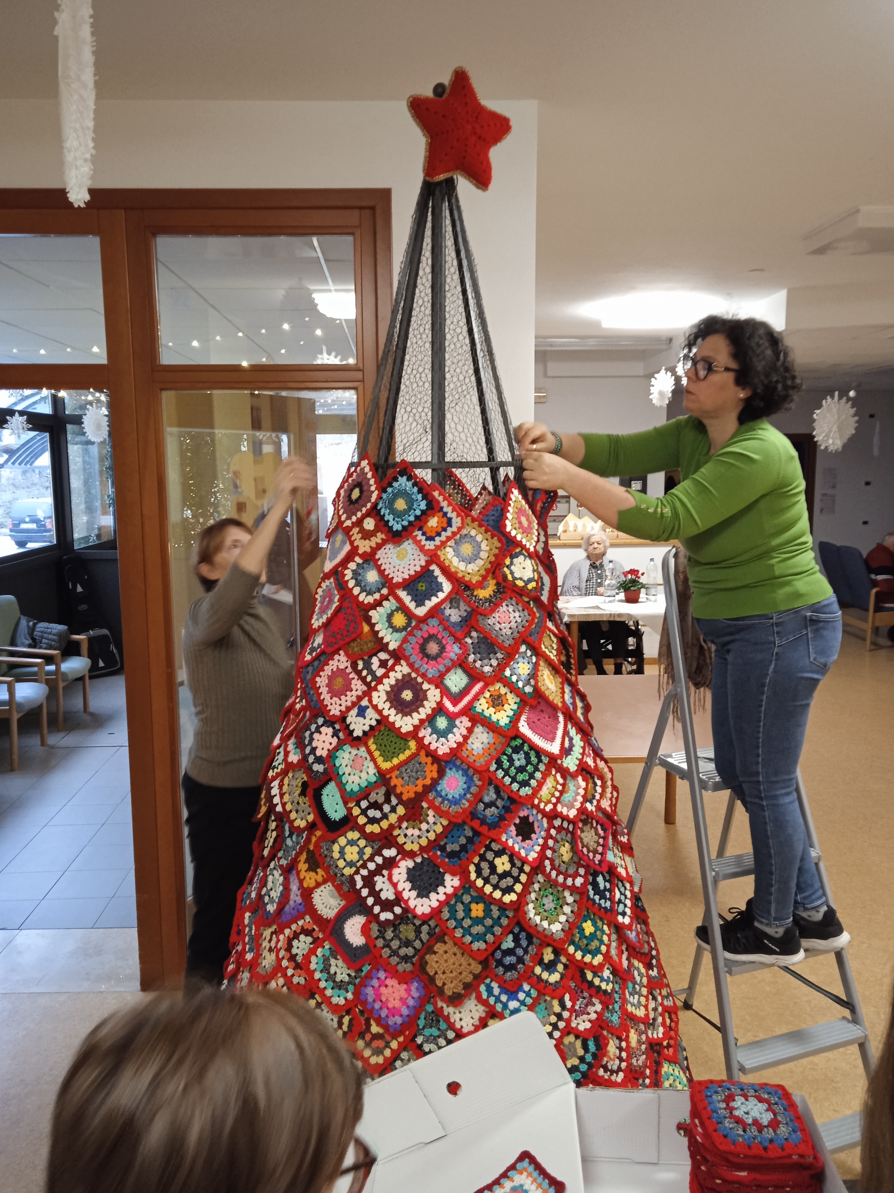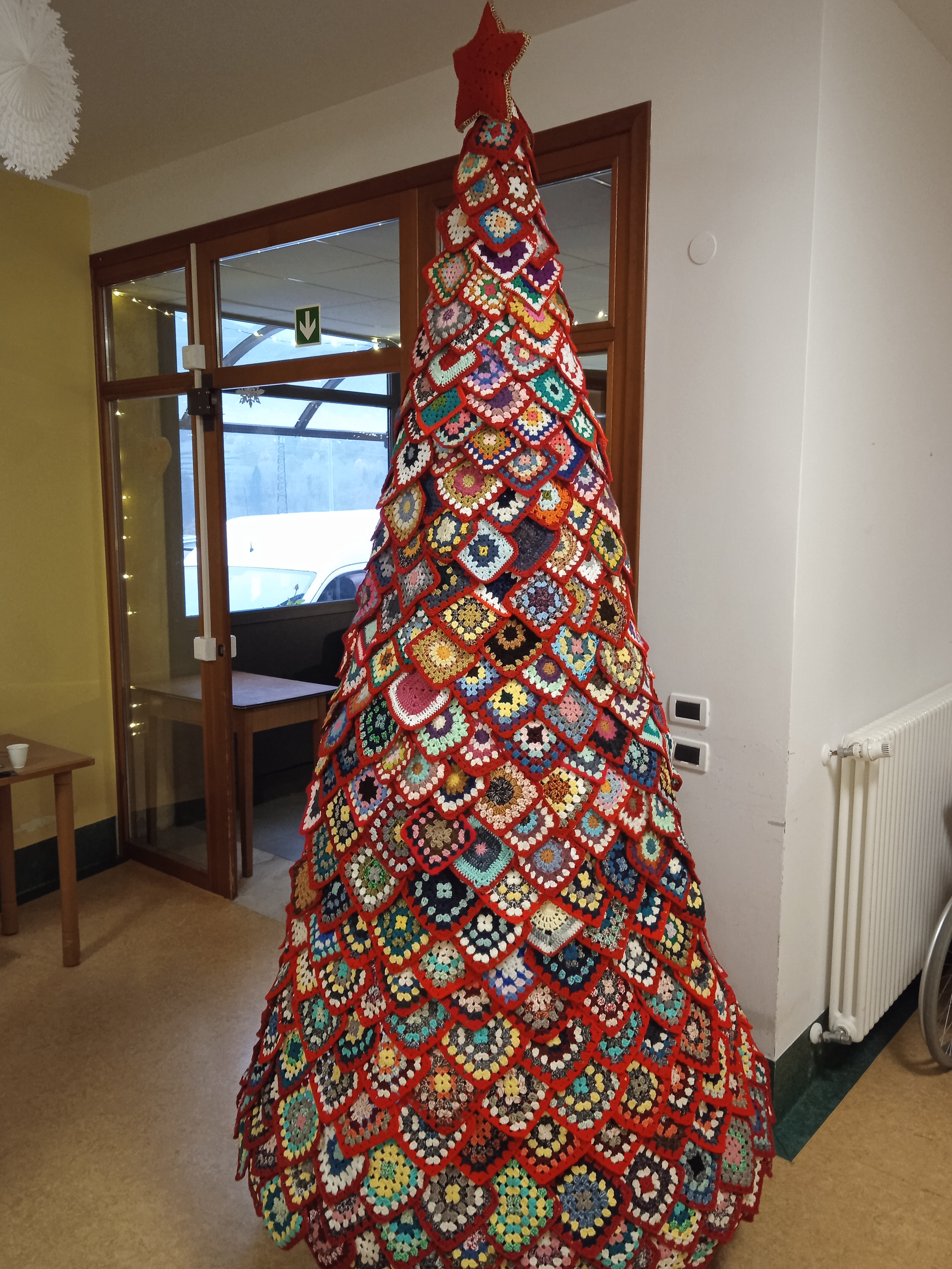 Un albero di Natale innovativo formato da centinaia di piastrelle fatte ad uncinetto.