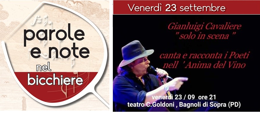 DAL 23 AL 25 SETTEMBRE ARRIVA A BAGNOLI DI SOPRA LA MANIFESTAZIONE "PAROLE E NOTE NEL BICCHIERE" CON RECITAL, TEATRO, INCONTRI CON GLI AUTORI, MUSICA TUTTI DEDICATI AL TEMA DEL VINO E NATURALMENTE UN BRINDISI ALL'ARTE CON CALICE DI VIN FRIULARO DI BAGNOLI DOCG.