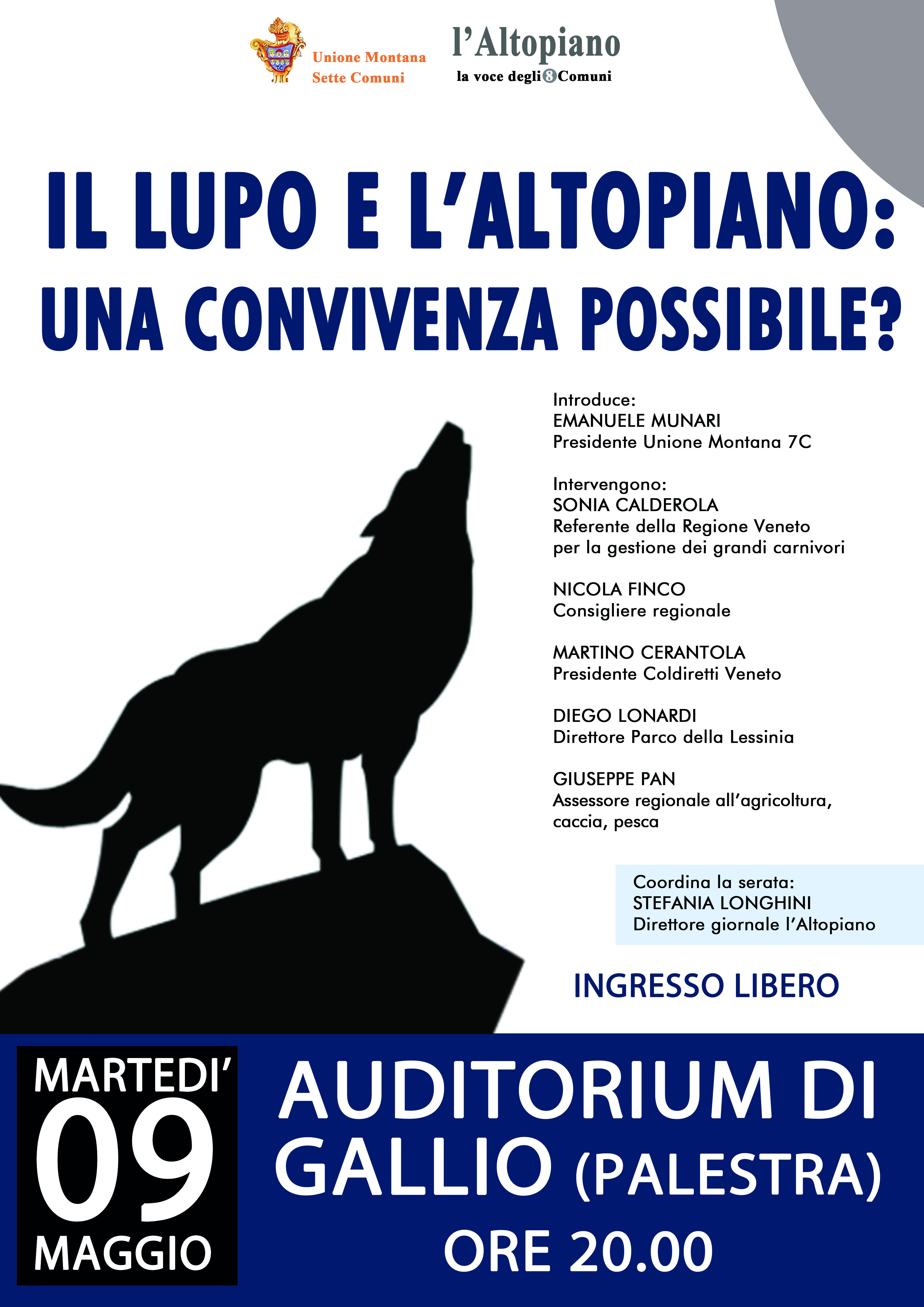 E' stato organizzato un incontro sul tema "convivenza con il lupo" per il giorno martedì 9 maggio ore 20.00 presso l'auditorium (palestra) di Gallio.
