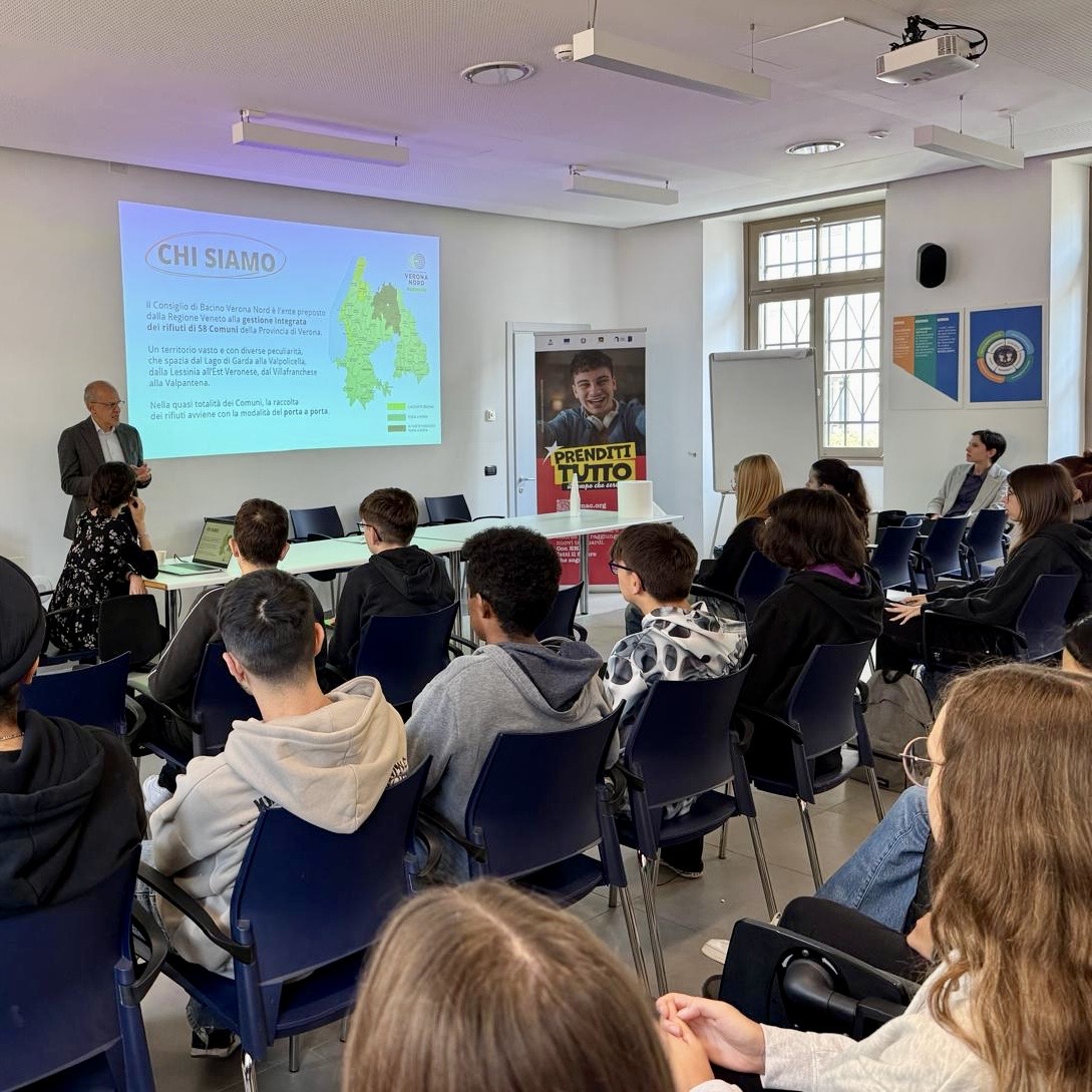 La seconda parte della presentazione, sviluppata dalla nostra responsabile comunicazione Silvia Bevilacqua, si è configurata come un vero e proprio briefing con studenti e studentesse dell'Istituto Canossiano, con l'obiettivo di condividere spunti di riflessioni e desiderata del Consiglio di Bacino Verona Nord. Il progetto assegnato alle due classi terze prevede la realizzazione di un video che risulti coinvolgente per i loro coetanei. Saranno gli studenti stessi ad identificare il contenuto del messaggio da veicolore e a scegliere la modalità narrativa per rappresentarlo.