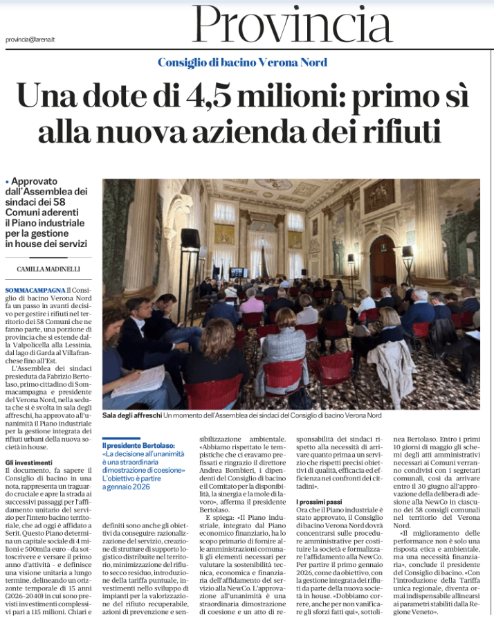 Un passo decisivo per il futuro della gestione rifiuti nel bacino Verona Nord è stato compiuto giovedì 10 aprile, dall’Assemblea dei Sindaci riunita nella Sala Affreschi del Comune di Sommacampagna, con l’approvazione del Piano Industriale per la gestione integrata dei rifiuti urbani della nuova società in house.