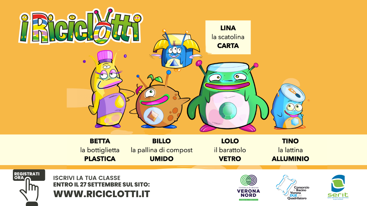 ‘I RICICLOTTI’ sono pronti a sbarcare nelle scuole primarie della Provincia di Verona con la nuova edizione del progetto di educazione ambientale promosso dal Consiglio di Bacino Verona Nord in collaborazione con il Consorzio di Bacino Verona Due del Quadrilatero e Serit.