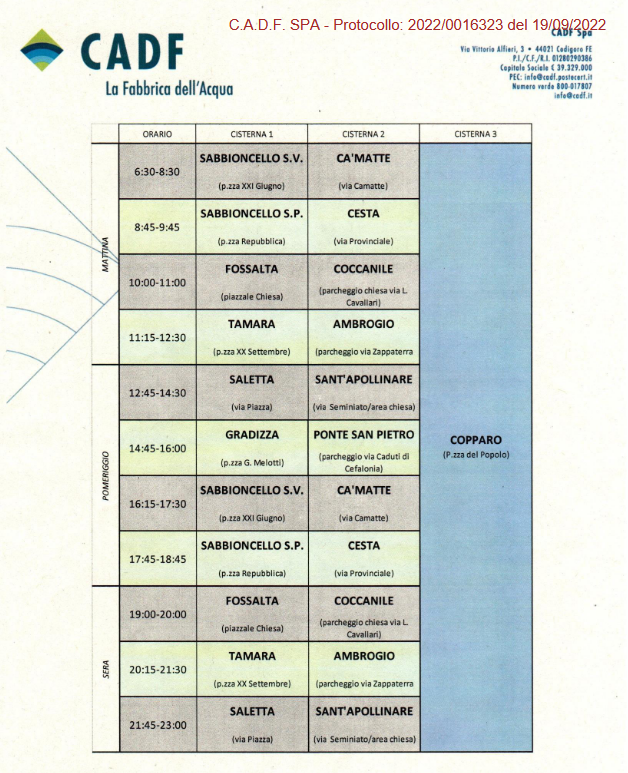Durante il periodo dell’interruzione saranno disponibili numero 3 (tre) autocisterne per la fornitura di acqua potabile con le modalità riportate nell’allegato prospetto fornito dal CADF (Ciclo integrato Acquedotto Depurazione Fognatura). Vedi allegato riportato sotto.