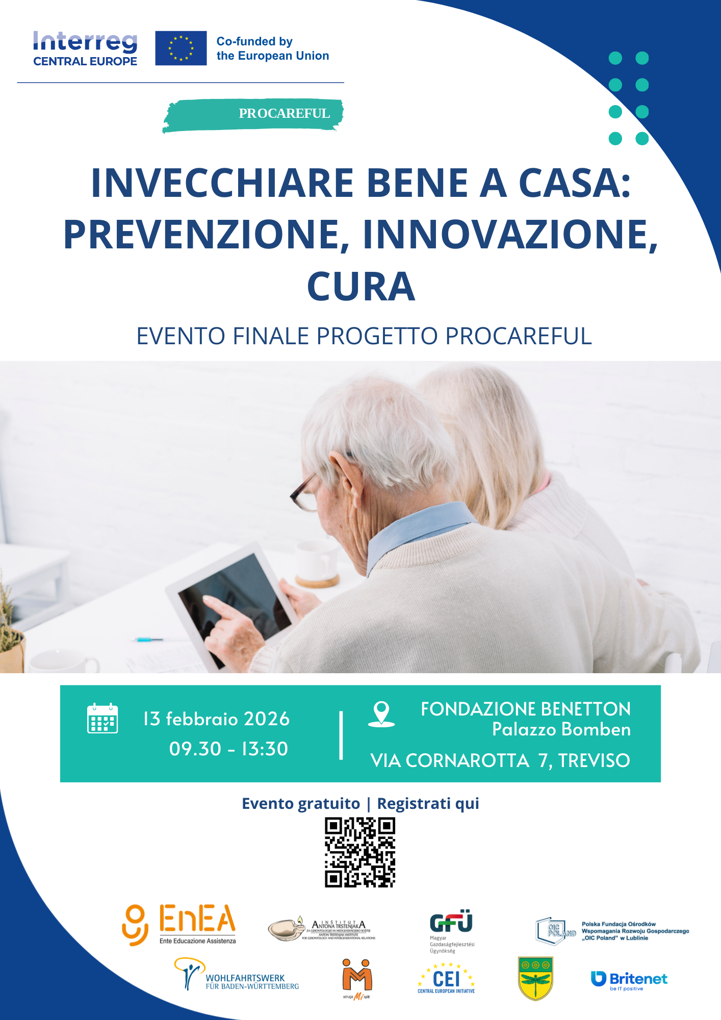 Siamo lieti di invitare tutti gli interessati all’evento “Invecchiare bene a casa: prevenzione, innovazione, cura”, che si terrà il 13 febbraio 2026 presso Fondazione Benetton, Treviso. La conferenza rappresenta un importante momento di confronto e condivisione, riunendo esperti, organizzazioni e decisori provenienti da tutta l’Europa Centrale per affrontare una delle sfide più rilevanti della nostra società: promuovere un invecchiamento sano, attivo e sicuro a domicilio. L’evento sarà strutturato attorno a tre pilastri fondamentali: la prevenzione, l'innovazione e la cura, offrendo una panoramica su soluzioni concrete, modelli di intervento innovativi e strategie future per migliorare la qualità della vita delle persone anziane. Durante la mattinata, i partecipanti avranno l’opportunità di: - approfondire approcci innovativi all’assistenza domiciliare; - conoscere come altri progetti europei stanno sviluppando nuovi modelli di cura e supporto all’invecchiamento attivo; - partecipare a dibattiti sul futuro dell'invecchiamento a domicilio e sul contributo delle tecnologie emergenti. L’evento si svolgerà in presenza, con traduzione simultanea in italiano e inglese, per garantire la massima accessibilità. A conclusione dei lavori è previsto un momento conviviale, pensato per favorire lo scambio di idee, esperienze e contatti tra i partecipanti. Dettagli dell’evento: Data: 13 febbraio 2026 Orario: 9:30 – 13:30 (CET) Luogo: Fondazione Benetton, Via Cornarotta 7, Treviso La partecipazione è gratuita, ma è necessario riservare il proprio posto registrandosi al seguente link: https://forms.office.com/e/mhf43N5gCk