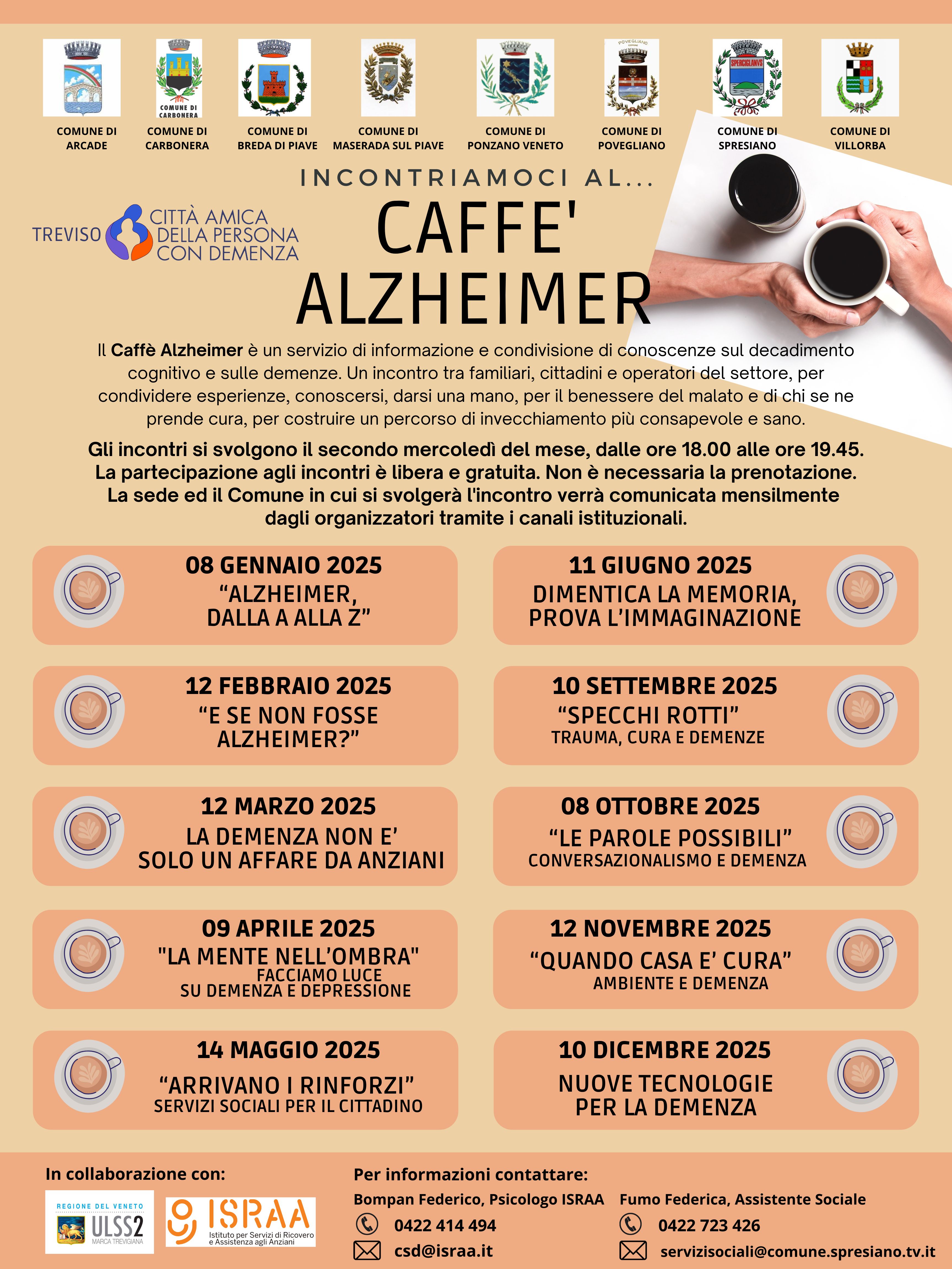 Un incontro tra famigliari, cittadini e operatori del settore per condividere esperienze, conoscersi e darsi una mano, per il benessere del malato e di chi se ne prende cura, per costruire un percorso di invecchiamento più consapevole e sano. Pubblichiamo il calendario con gli appuntamenti per l'anno 2025, segnaliamo che l'incontro dal titolo "La demenza non è solo un affare da anziani" inizialmente previsto per il mese di marzo, sarà posticipato al 9 aprile presso la Sala Polivalente di Arcade.