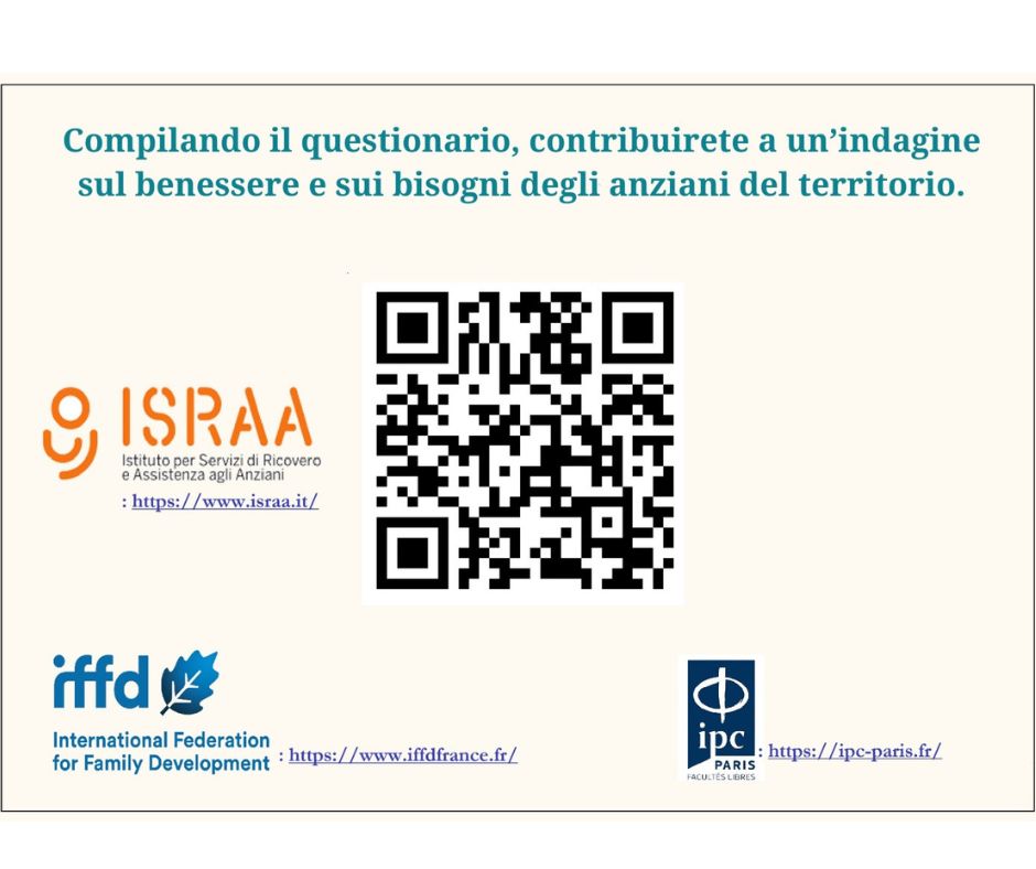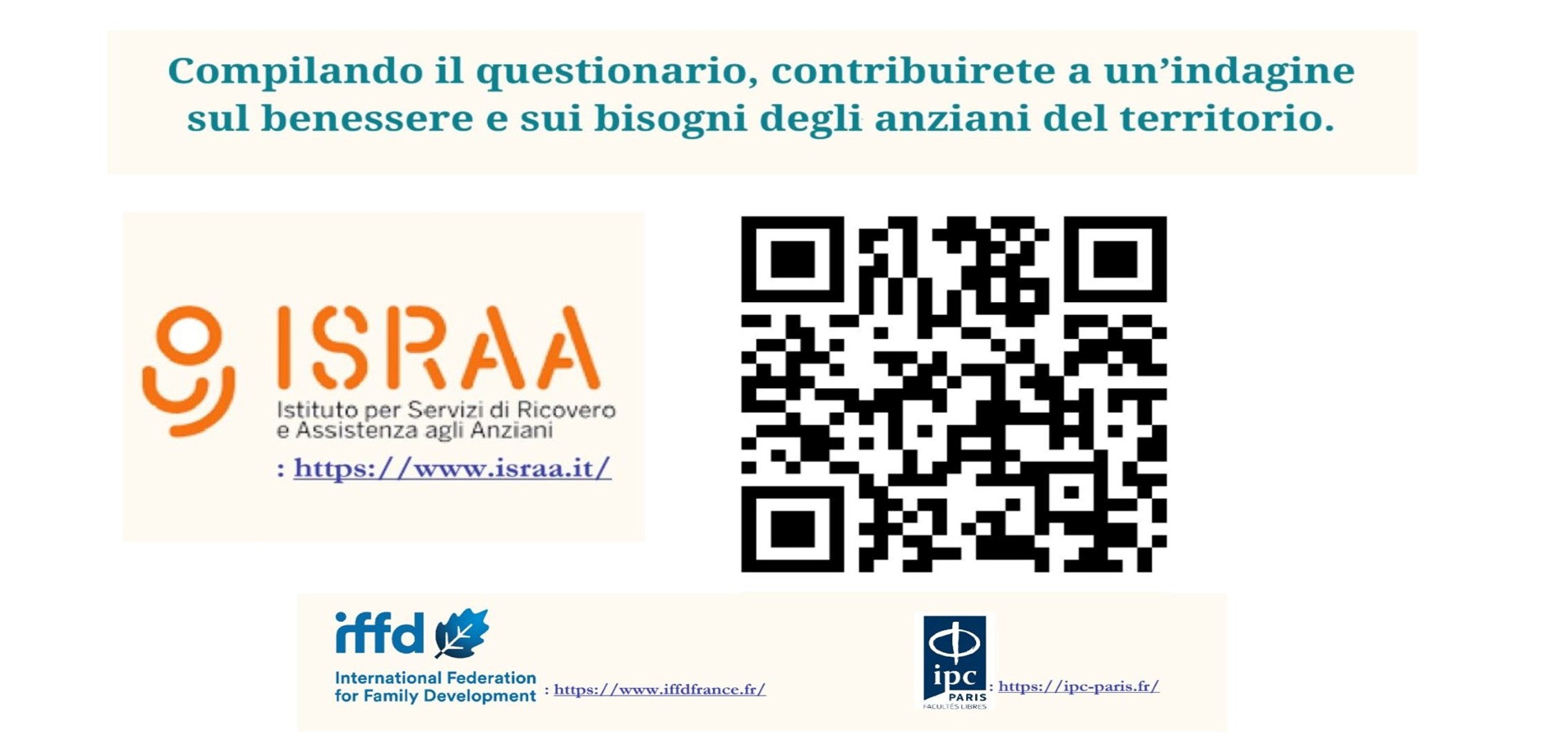 ISRAA sta conducendo una "Ricerca sui bisogni delle persone, con più di 65 anni, che vivono autonomamente presso il proprio domicilio", avvalendosi della collaborazione di alcuni partners internazionali. Per questo si chiede la partecipazione dei cittadini/e per la compilazione di un questionario on line, anonimo, che indaga come le persone affrontino il proprio invecchiamento e quali siano gli aspetti che possono facilitare il mantenimento della propria autonomia di vita a domicilio. I risultati dell'indagine verranno pubblicati sul sito istituzionale e utilizzati per orientare e programmare i servizi e progetti futuri, a supporto delle persone anziane. Nel questionario non verranno trattati dati personali, in conformità al GDPR.