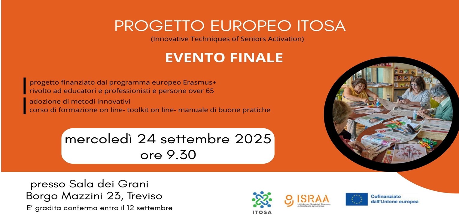 ISRAA è lieta di invitarvi all'evento finale del progetto europeo ITOSA (Innovative Techniques of Seniors Activation) del quale è partner, mercoledì 24 settembre 2025 alle ore 9.30 presso Sala dei Grani, Borgo Mazzini 23, a Treviso.