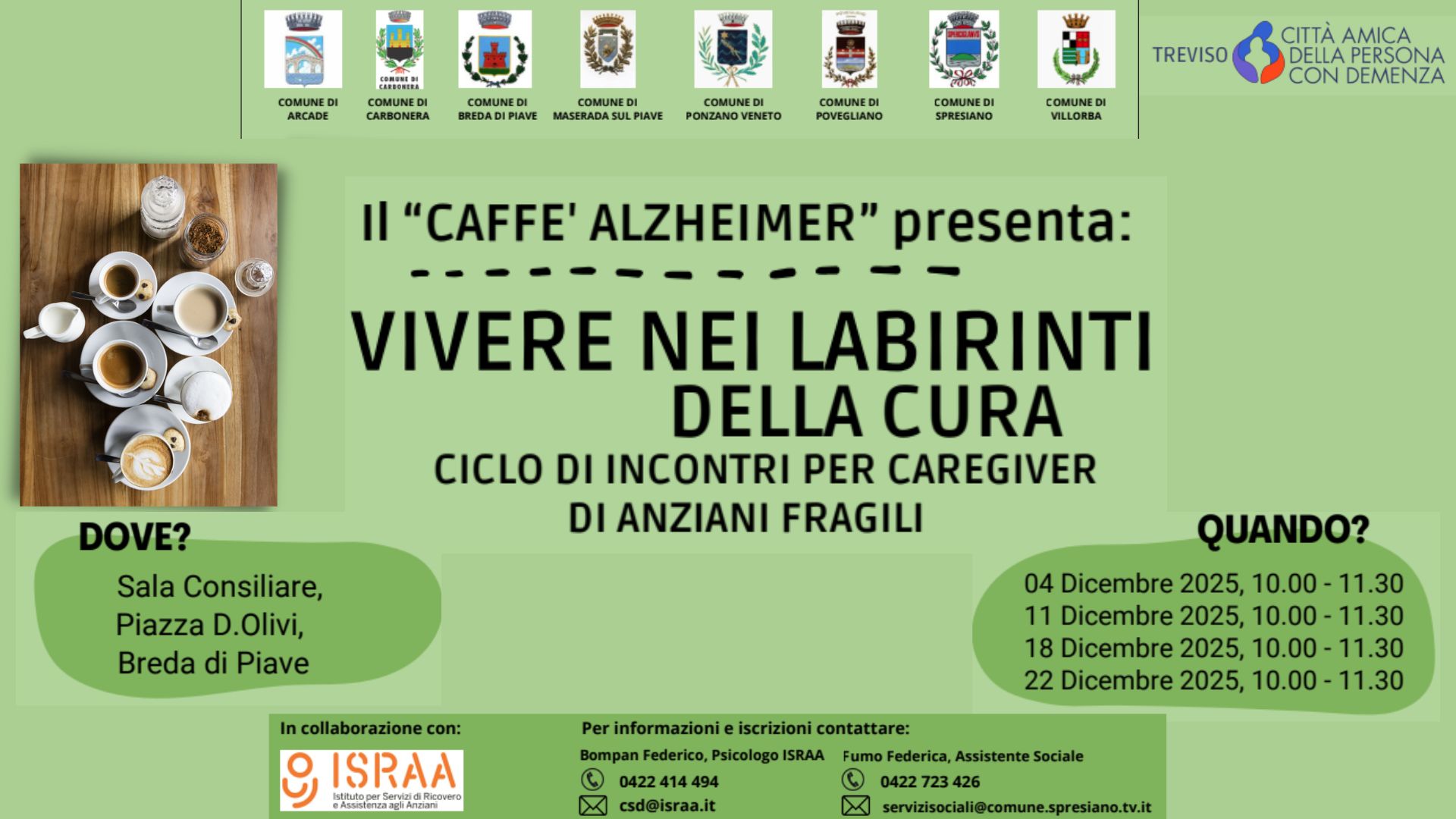 Il quarto ed ultimo ciclo per l'anno 2025, destinato a familiari caregiver di anziani con demenza, avrà inizio a Breda di Piave nella giornata di giovedì 4 dicembre. La partecipazione è riservata principalmente ai cittadini residenti nei Comuni che promuovono l’iniziativa. Per informazioni e iscrizioni contattate i numeri o le mail indicate nella locandina.