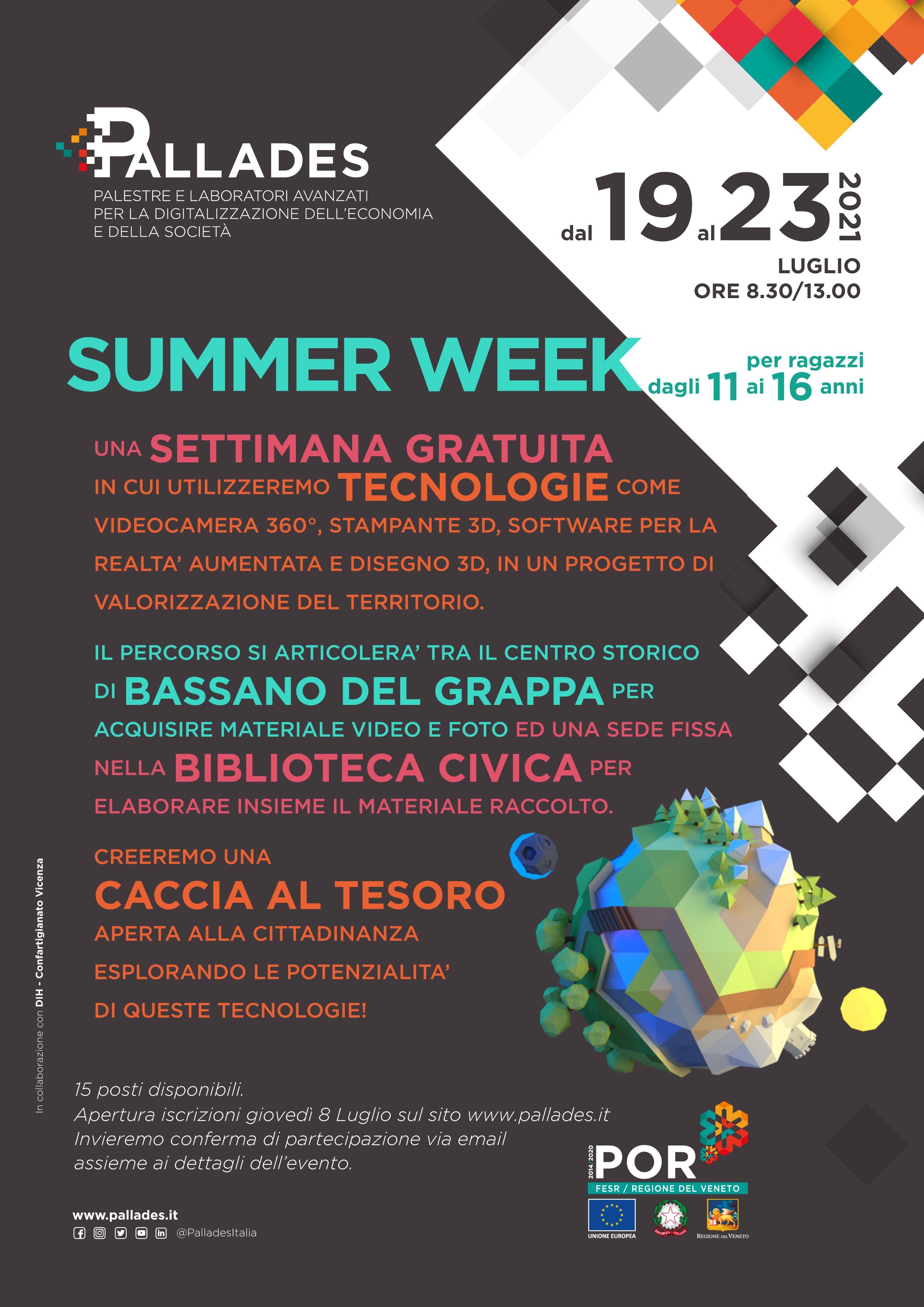 Una settimana gratuita dedicata a ragazze e ragazzi dagli 11 ai 16 anni dal 19 al 23 Luglio, in cui verranno utilizzate tecnologie come videocamera 360°, stampante 3D, software per la realtà aumentata e il disegno 3D in un progetto di valorizzazionr del territorio. Il percorso si articolerà tra il centro storico di Bassano del Grappa per acquisire materiale video e foto ed una sede fissa presso la Biblioteca Civica per elaborare insieme ilmateriale raccolto. Verrà creata una caccia al tesoro aperta alla cittadinanza esplorando le potenzilaità e il funzionamento di queste tecnologie! Ci si potrà iscrivere dall'8 Luglio sul sito www.pallades.it . Iniziativa rivolta ai residenti dei 15 comuni del progetto PALLADES: Bassano del Grappa, Asiago, Cartigliano, Cassola, Marostica, Colceresa; Mussolente, Nove, Pianezze, Pove del Grappa, Romano D'Ezzelino, Rosà, Rossano Veneto, Tezze sul Brenta e Valbrenta.