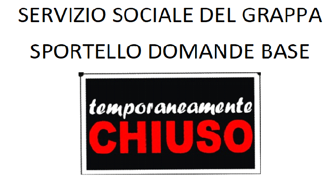 Si avvisa che lo Sportello "Domande Base" del Servizio Sociale del Grappa sarà chiuso fino al 3 aprile. Per necessità è possibile telefonare al nr. 0423/078934 dal lunedì al venerdì dalle ore 8.30 alle ore 13.00 e il martedì e giovedì dalle ore 15.00 alle ore 19.00, oppure contattare direttamente gli assistenti sociali al cellulare di servizio: