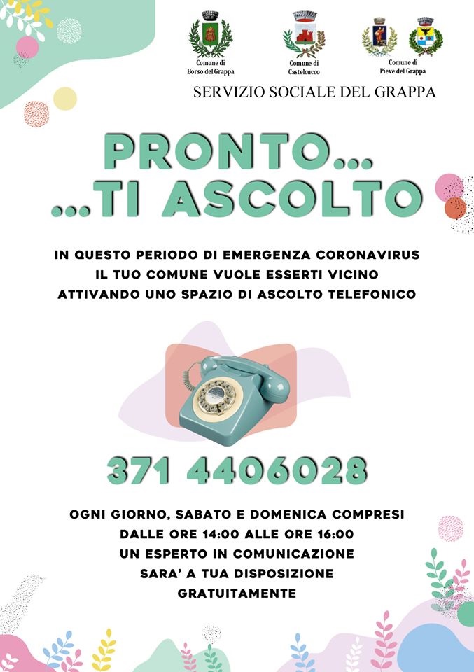 In questo periodo di emergenza Coronavirus il tuo Comune vuole esserti vicino attivando uno spazio di ascolto telefonico. Ogni giorno, sabato e domenica compresi, dalla ore 14:00 alle ore 16:00, chimando il numero 371.4406028 un esperto in comunicazione sarà a tua disposizione gratuitamente.