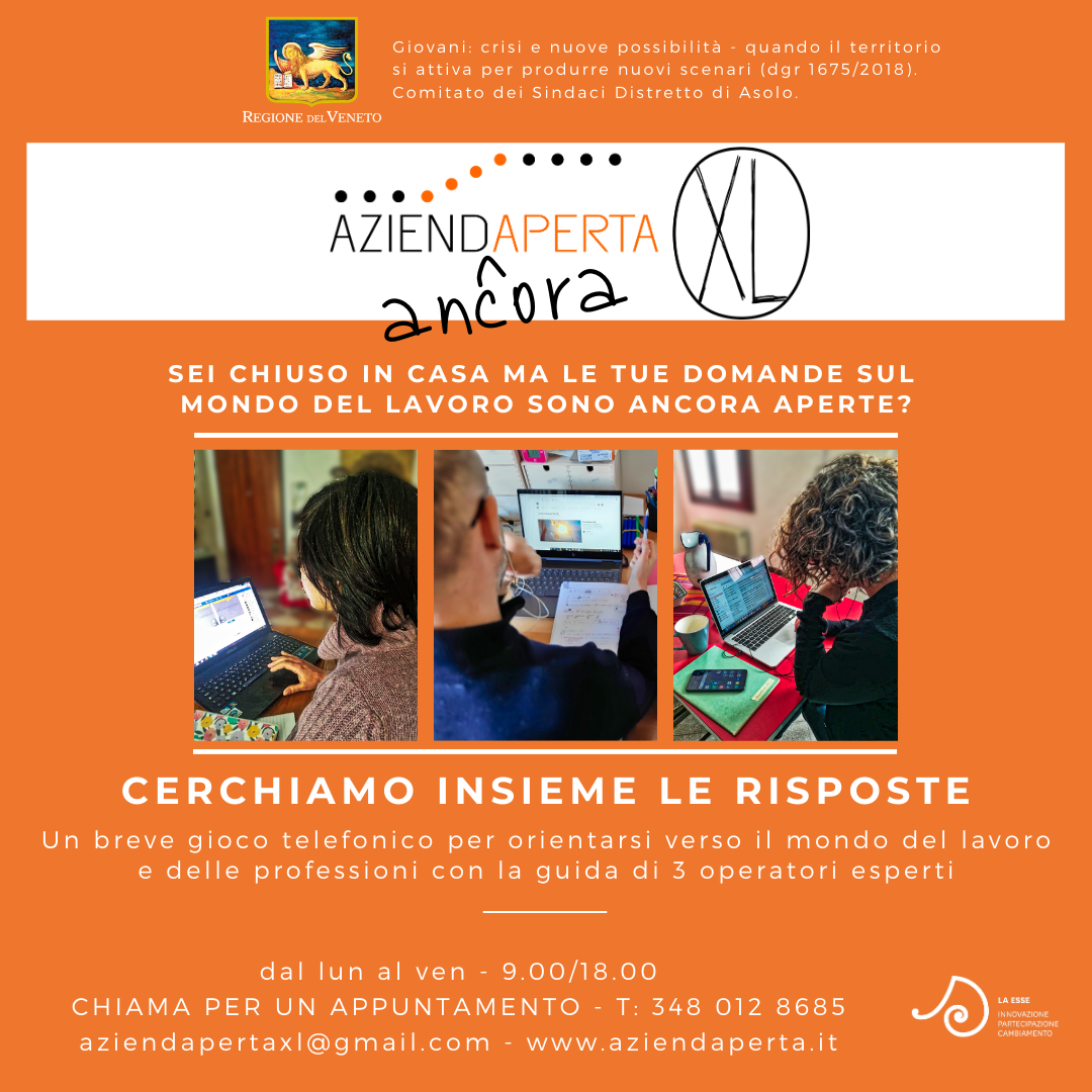 Il progetto AziendAperta XL riprende e si rivolge sempre ai giovani under 30 alla prese con la tematica della ricerca lavorativa offrendo uno spazio di consulenza individuale, da remoto attraverso telefonate al nr. 348.0128685 dal lun. al ven. dalle ore 9 alle ore 18.00.