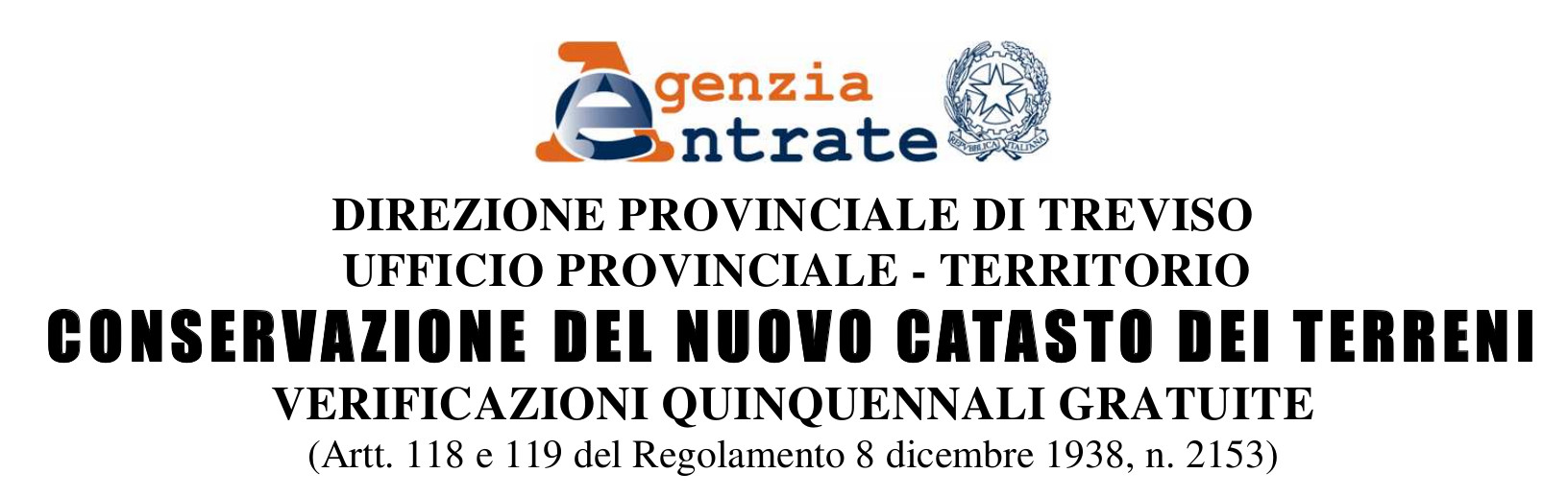 Nel corso del 2021, l’Agenzia delle Entrate farà la verifica quinquennale per rilevare e accertare i cambiamenti avvenuti - sia in aumento che in diminuzione - nella superficie, nella configurazione e nel reddito dei terreni (Articoli 118 e 119 del Regolamento n.2153/1938) nei comuni di: Altivole; Asolo; Borso del Grappa; Caerano di San Marco; Castelcucco; Castelfranco Veneto; Castello di Godego; Cavaso del Tomba; Cornuda; Fonte; Loria; Maser; Monfumo; Montebelluna; Pieve del Grappa;Possagno; Resana; Riese Pio X; San Zenone degli Ezzelini; Trevignano; Vedelago.