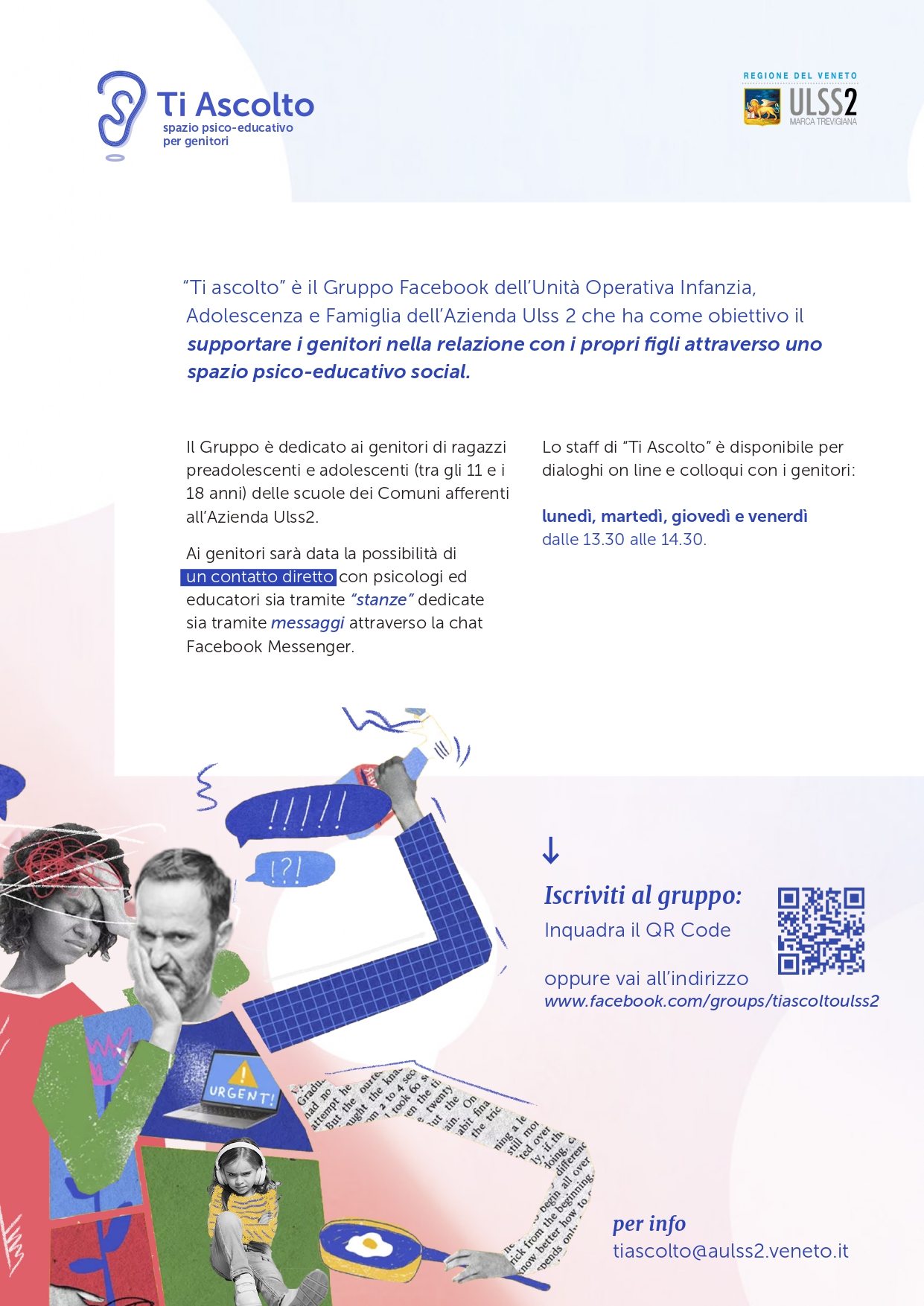 “Ti ascolto” è il Gruppo Facebook dell’Unità Operativa Infanzia, Adolescenza e Famiglia dell’Azienda Ulss 2 che ha come obiettivo il supportare i genitori nella relazione con i propri figli attraverso uno spazio psico-educativo social.