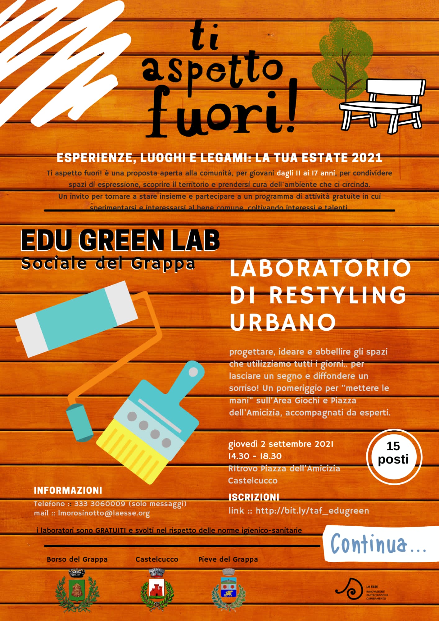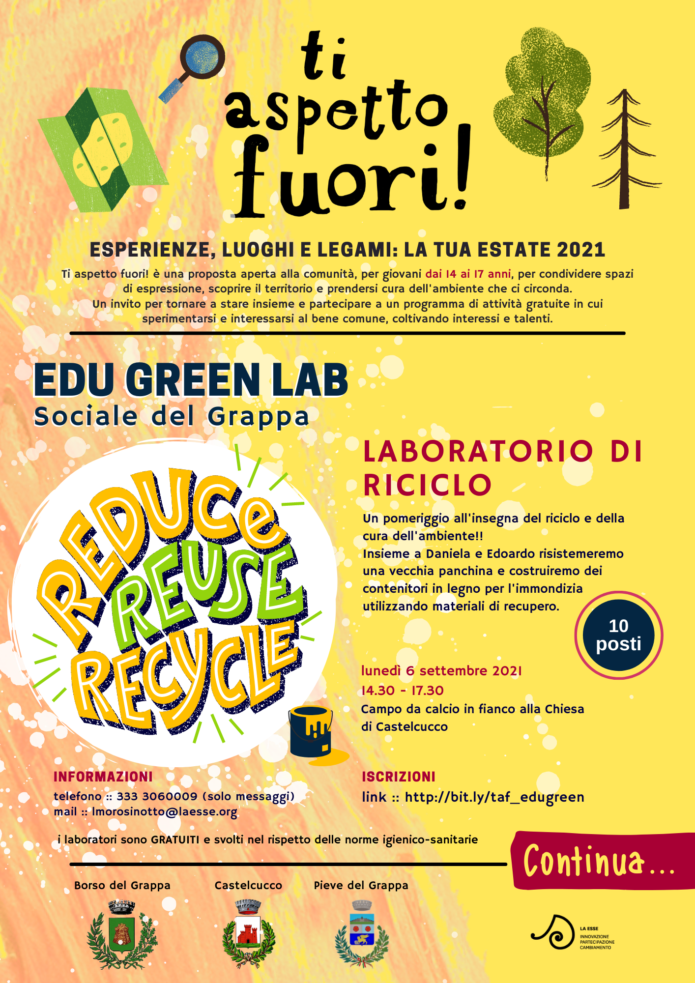 Ecco i prossimi laboratori EDU GREENLAB #tiaspettofuori per ragazzi e ragazze residenti a Castelcucco, Pieve del Grappa e Borso del Grappa!