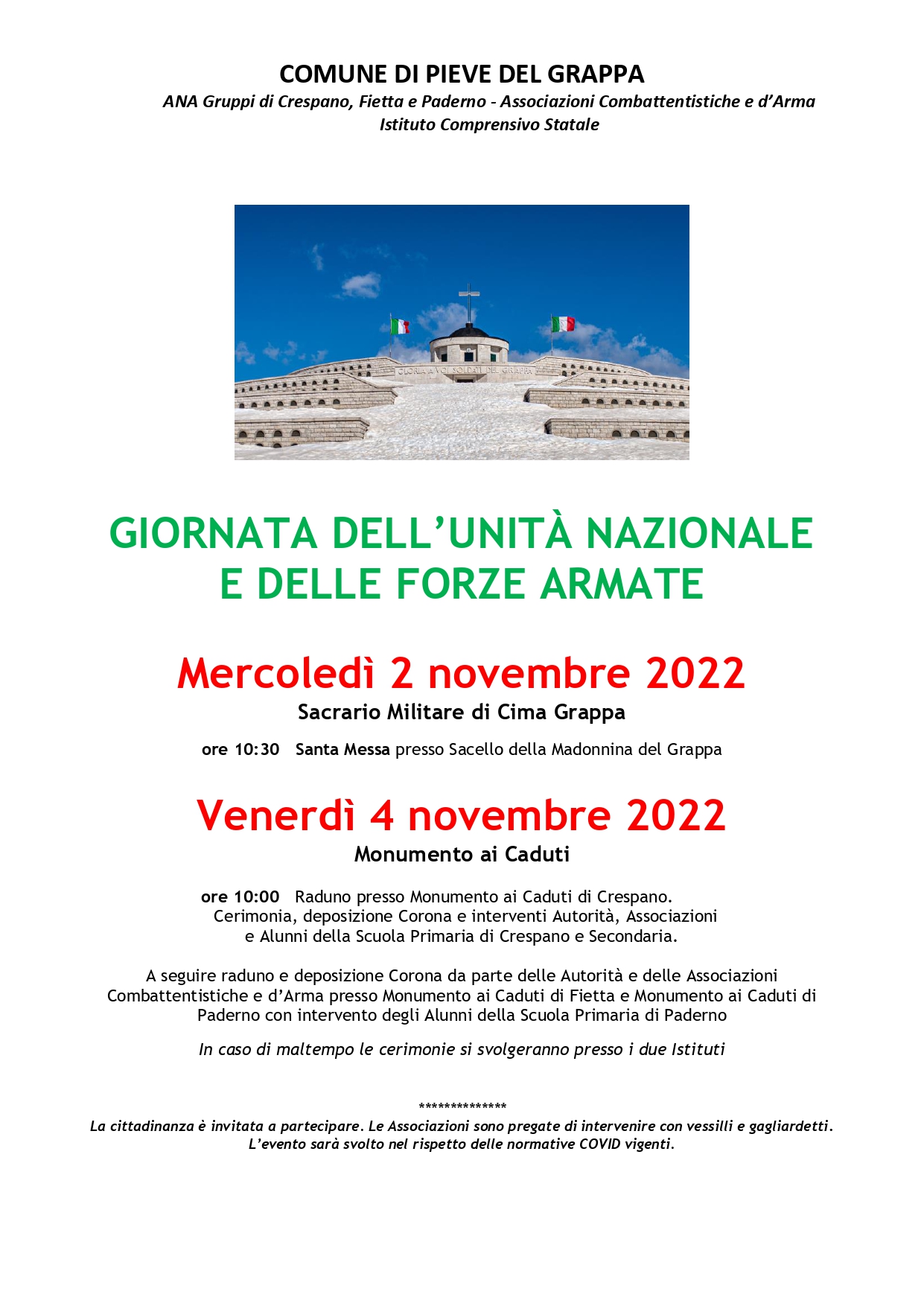 Il comune di Pieve del Grappa, in collaborazione con i gruppi Ana di Crespano, Fietta e Paderno, nonchè con l'Istituto Comprensivo Statale, ha il piacere di invitare la cittadinanza tutta alle celebrazioni in programma per la Giornata dell'Unità Nazionale e delle Forze Armate in programma per il 2 e 4 novembre.