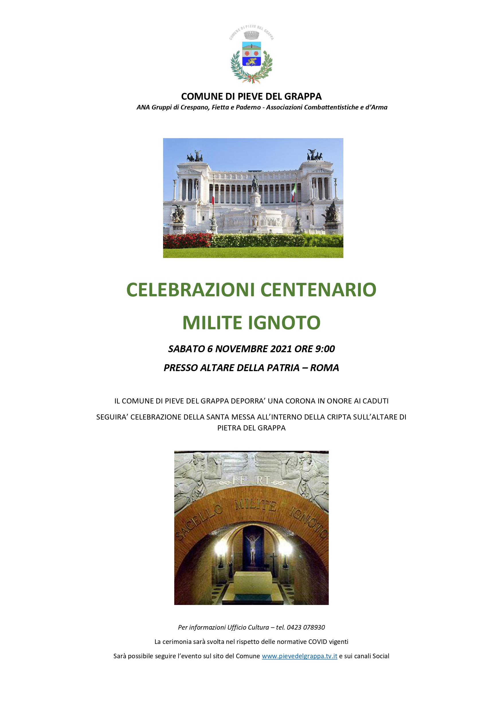 Sabato 6 novembre p.v., alle ore 9:00, il Comune di Pieve del Grappa deporrà una corona in onore ai Caduti presso l'Altare della Patria di Roma. Seguirà la celebrazione della Santa Messa all'interno della cripta sull'Altare di pietra del Grappa. Dettagli in locandina.