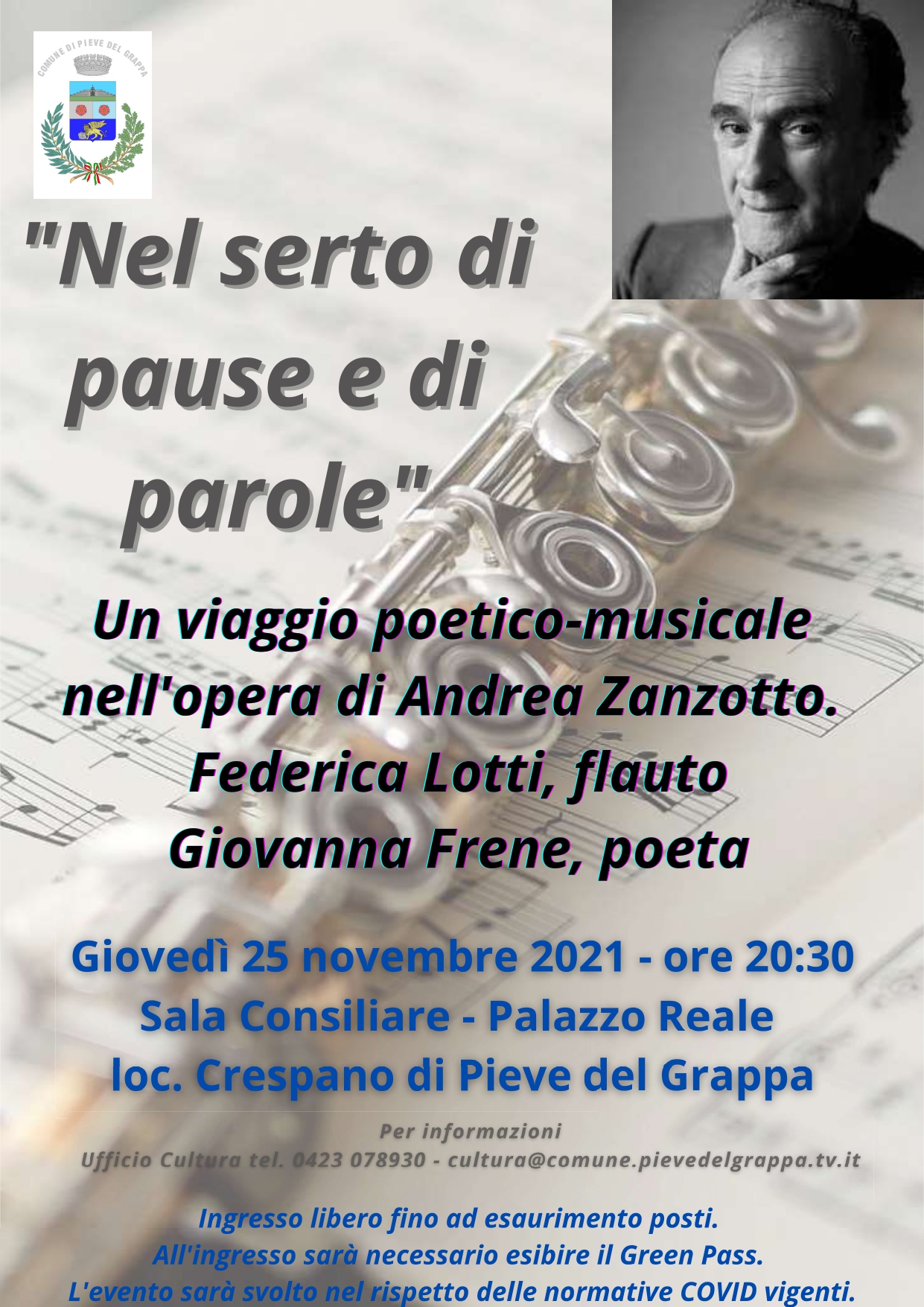 Giovedì 25 novembre, alle ore 20:30, la sala Consiliare di Palazzo Reale a Pieve del Grappa ha il piacere di ospitare una serata in onore del poeta Andrea Zanzotto, nell'autunno a lui dedicato. Lo spettacolo poetico - musicale vedrà susseguirsi un dialogo continuo tra voce poetica e musicale, tra Federica Lotti, flauto e Giovanna Frene, poeta, un omaggio nel centenario della nascita del maestro.