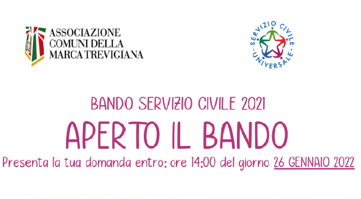 Si comunica l’uscita del Bando 2021 del "Servizio Civile Universale" che prevede la possibilità per tutti i giovani dai 18 ai 28 anni di presentare domanda in uno dei 220 posti disponibili negli 8 progetti di rete, presentati anche per il Comune di Pieve del Grappa (area cultura e patrimonio) e per il Servizio Sociale Associato (Comuni di Borso del Grappa e Pieve del Grappa) dall’Associazione Comuni Marca Trevigiana.