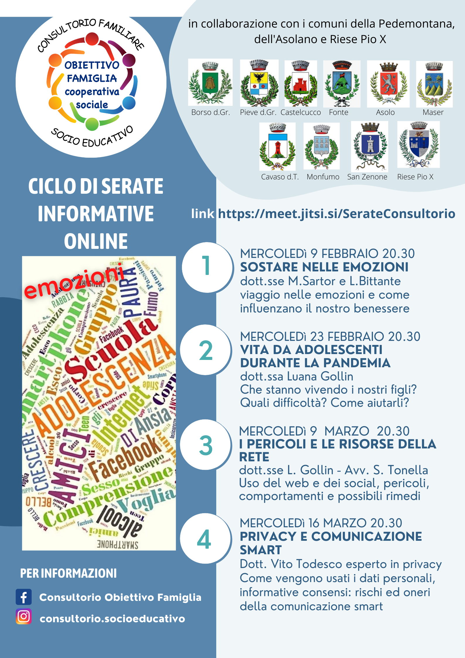 Al via un ciclo di incontri online tenuti da esperti rivolti a genitori, educatori e quanti intertessati alle tematiche proposte dalla cooperativa “Obiettivo Famiglia” in collaborazione con i Comuni del territorio: un’occasione da non perdere per approfondire alcuni dinamiche della relazione educativa e del mondo dei nostri figli, piccoli e grandi.