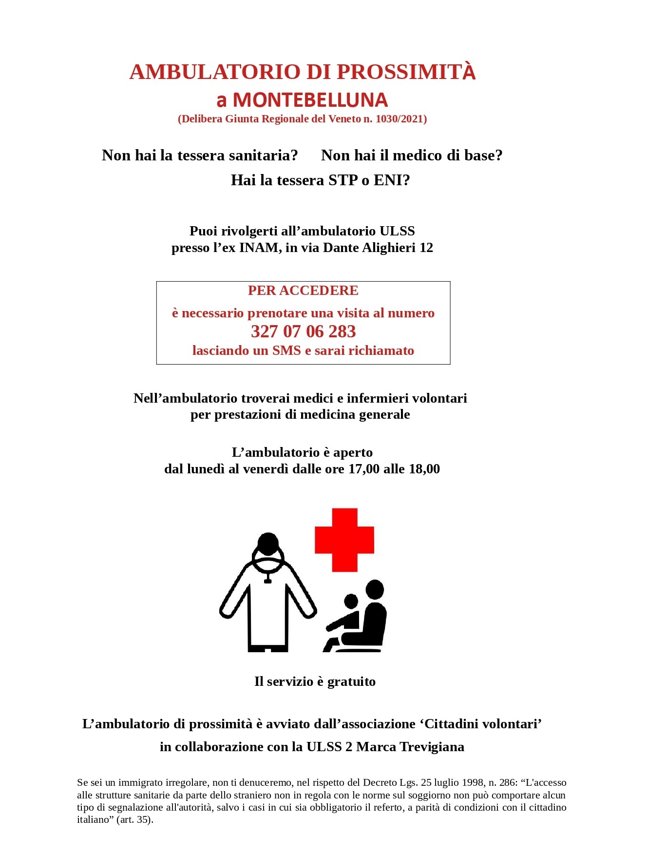 L’ambulatorio di Montebelluna si trova presso l’ex-INAM, via Dante Alighieri 12. È aperto dal lunedì al venerdì dalle ore 17 alle ore 18. Per prenotazioni, inviare SMS al 3270706283.