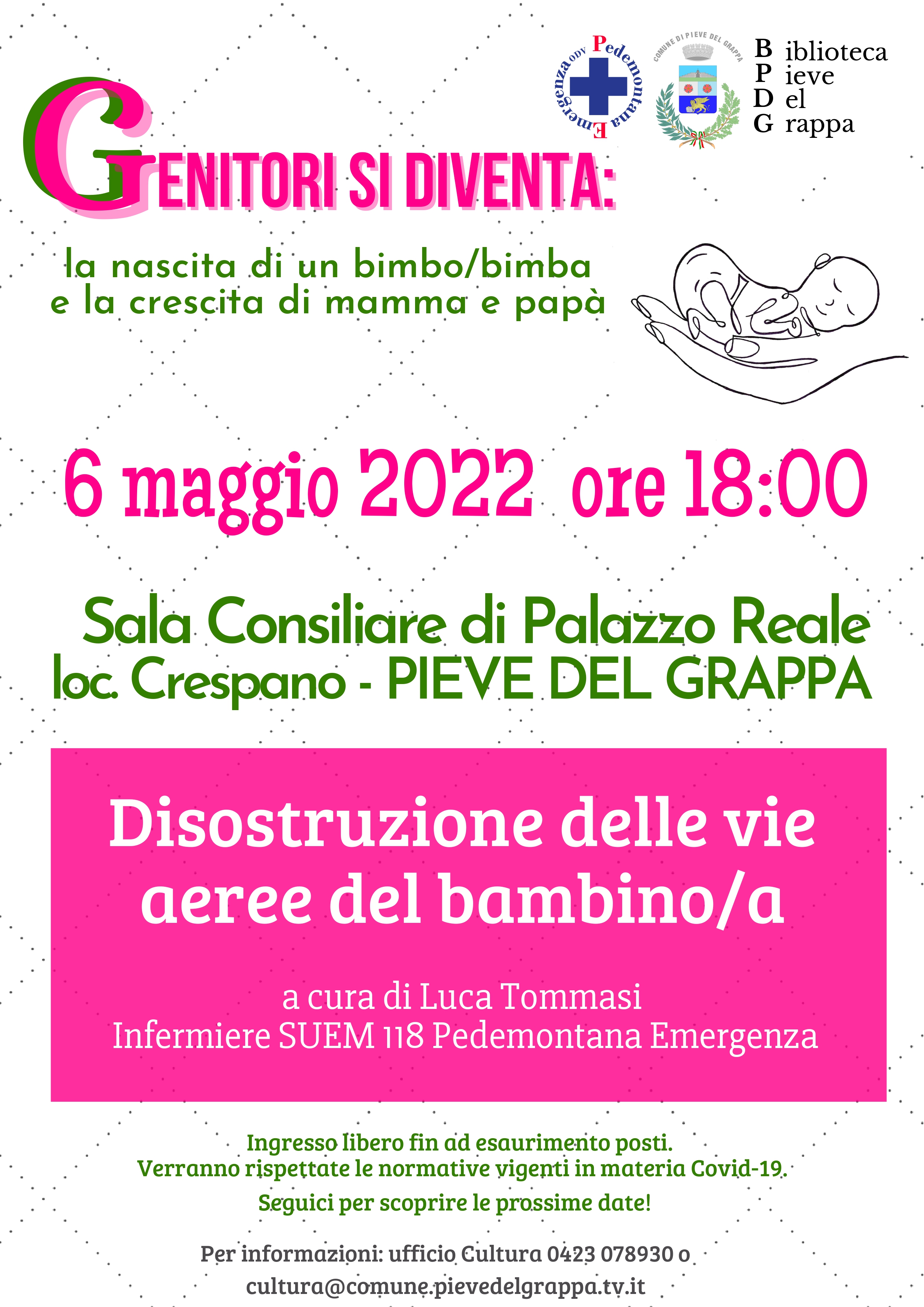 Venerdì 6 maggio p.v., alle ore 18:00, in Sala Consiliare di Palazzo Reale a Pieve del Grappa (loc. Crespano), si terrà l'incontro informativo dal titolo: "DISOSTRUZIONE DELLE VIEE AEREE DEL BAMBINO/A" a cura di Luca Tommasi, Infermiere SUEM 118 Pedemontana Emergenza.