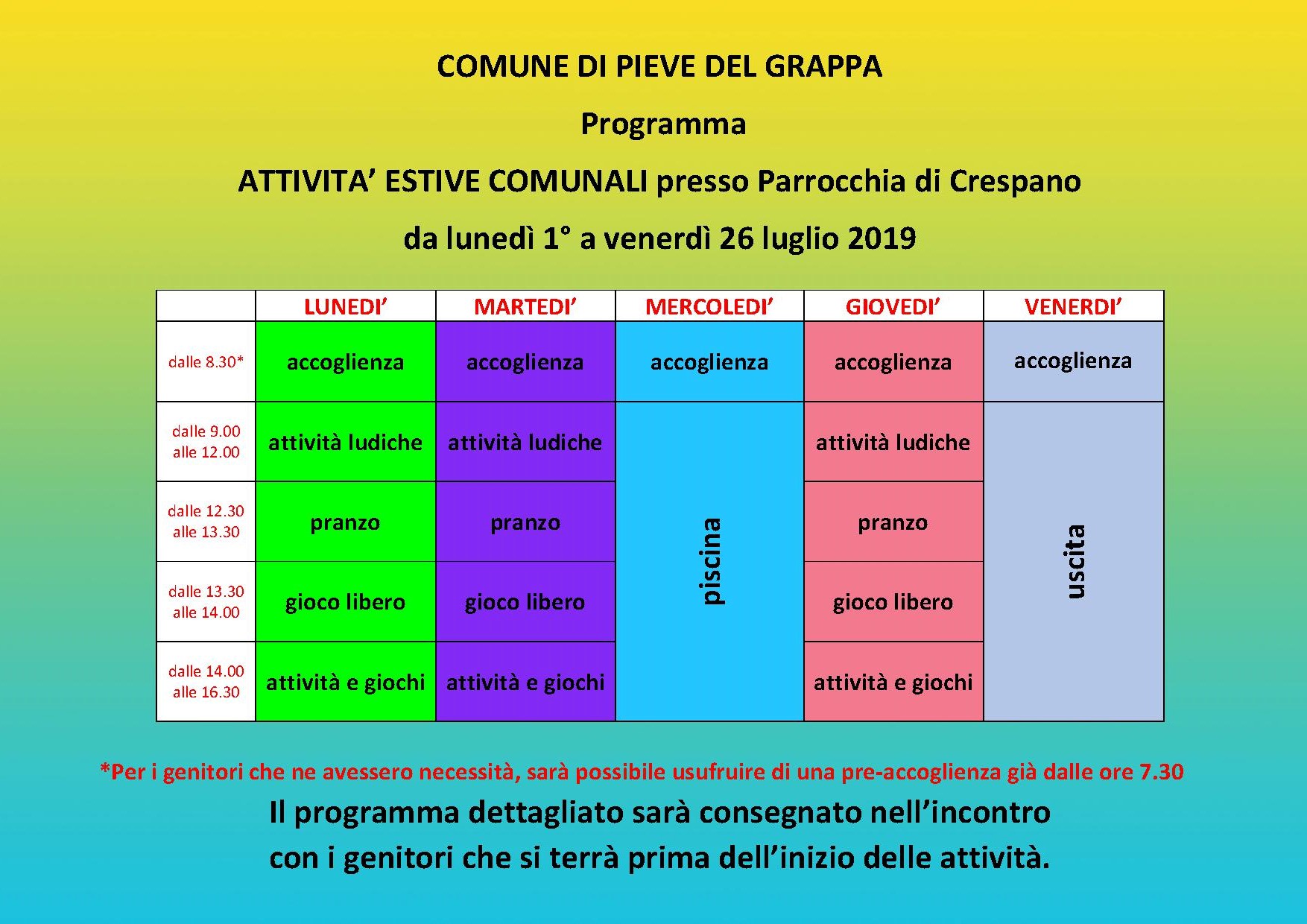 la scuola primaria.Le attività si svolgeranno nel mese di luglio presso il Patronato di Crespano.