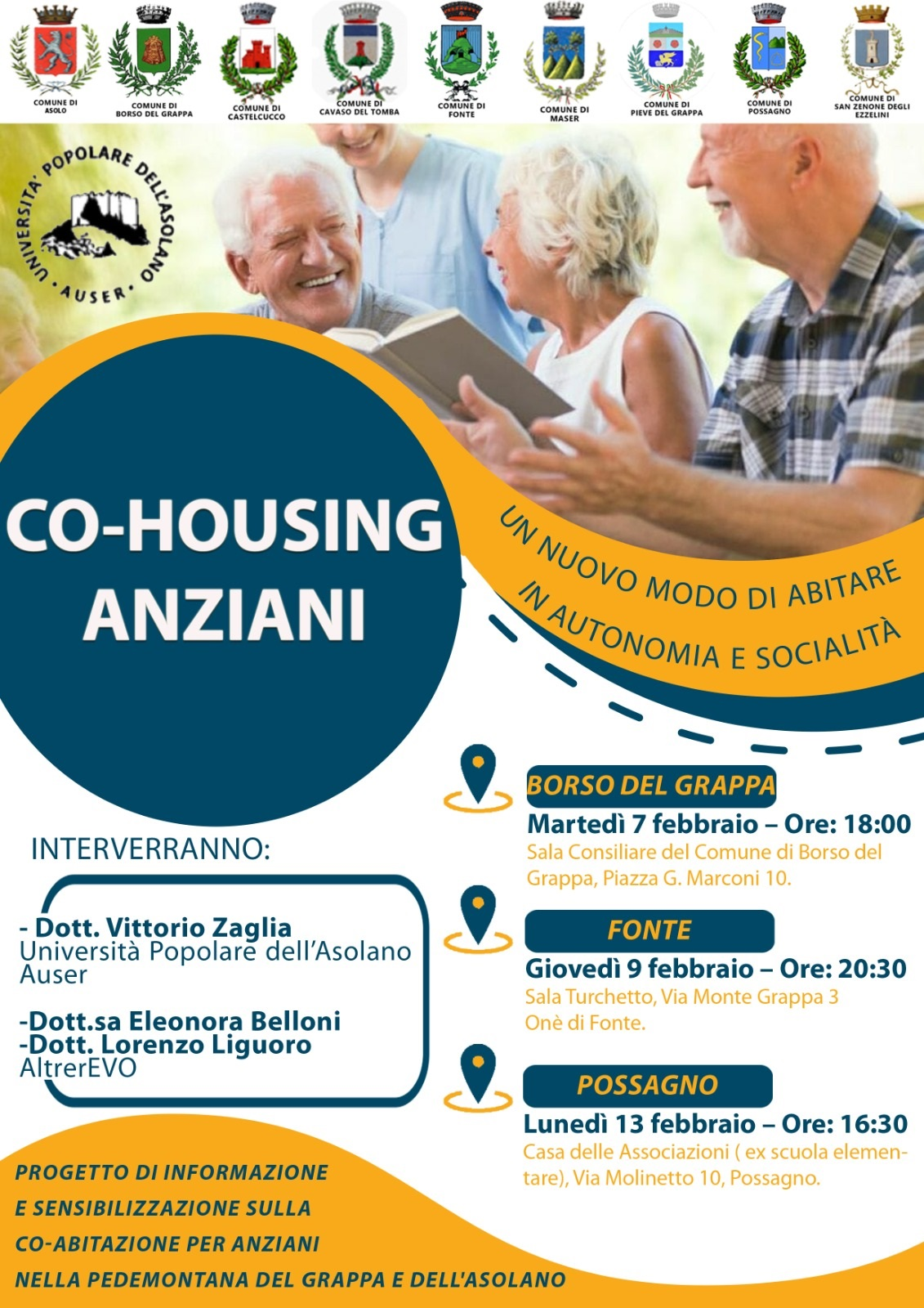 Allo scopo di promuovere il progetto Co-housing dedicato agli over 65, si invita la cittadinanza a prendere parte ad una serata informativa, con l’obiettivo di diffondere l’iniziativa e di condividere pensieri ed esperienze:• BORSO DEL GRAPPA, Sala consiliare del Comune di Borso del Grappa – martedì 7 febbraio alle ore 18:00
