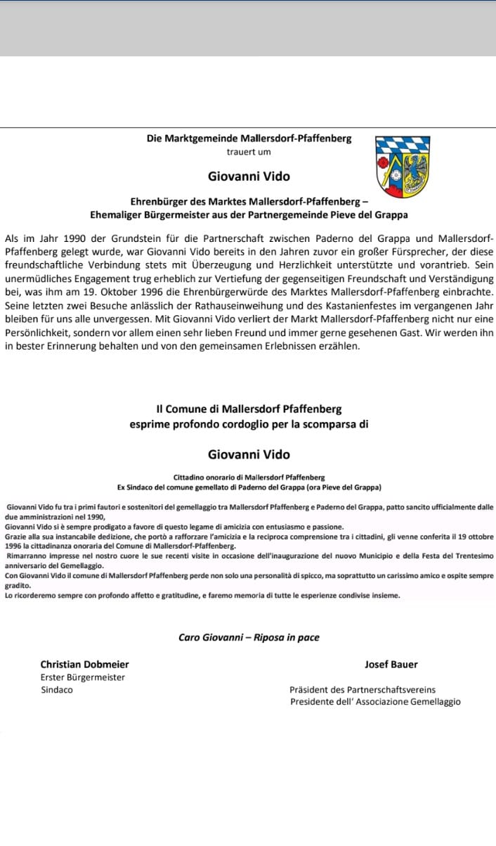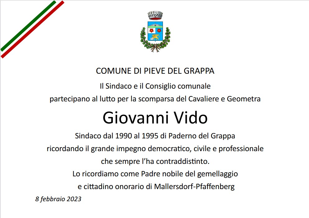 Il Sindaco e il Consiglio Comunale di Pieve del Grappa, l'Associazione Gemellaggi e Scambi culturali di Pieve del Grappa e il Comune di Mallersdorf-Pfaffenberg esprimono il proprio cordoglio per la scomparsa di Giovanni Vido, ex Sindaco di Paderno del Grappa e Cittadino onorario di Mallersdodorf-Pfaffeberg.