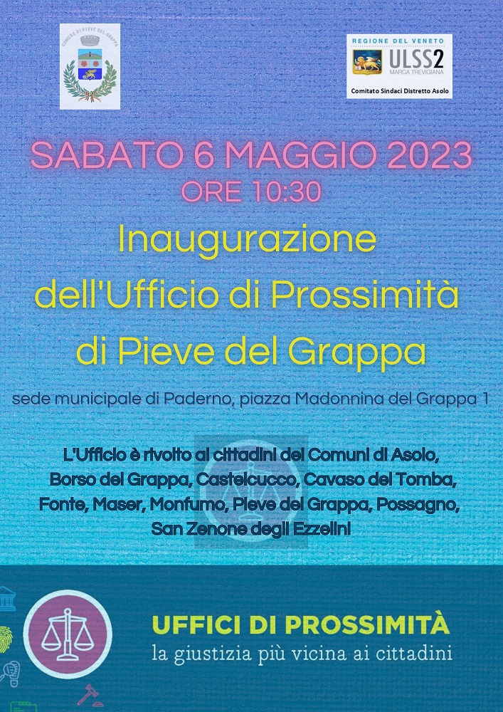 I cittadini sono invitati all’inaugurazione dell'Ufficio di Prossimità sabato 6 maggio p.v., alle ore 10:30, presso la sede municipale di Paderno del Grappa sita in piazza Madonnina del Grappa, 1.