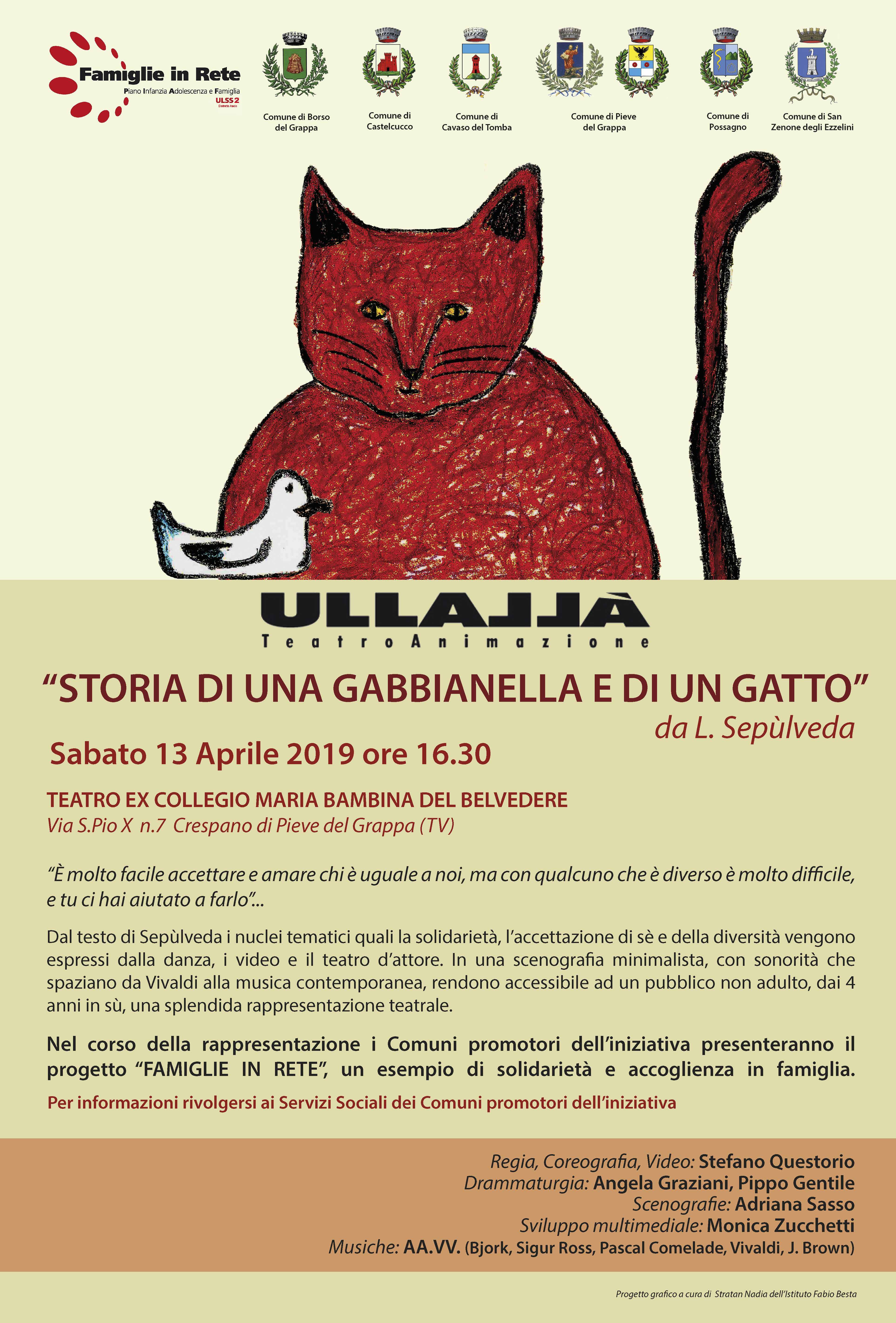 I Comuni di Borso del Grappa, Castelcucco, Cavaso del Tomba, Pieve del Grappa, Possagno e San Zenone degli Ezzelini in collaborazione con Famiglie in Rete Ulss2 Distretto di Asolo, vi invitano sabato 13 aprile 2019 alle ore 16.30, allo spettacolo teatrale "Storia di una gabbianella e di un gatto" a cura di Ullallà Teatro Animazione presso il Teatro ex Collegio Maria bambina del Benvedere, Via S. Pio X°, Crespano di Pieve del Grappa.