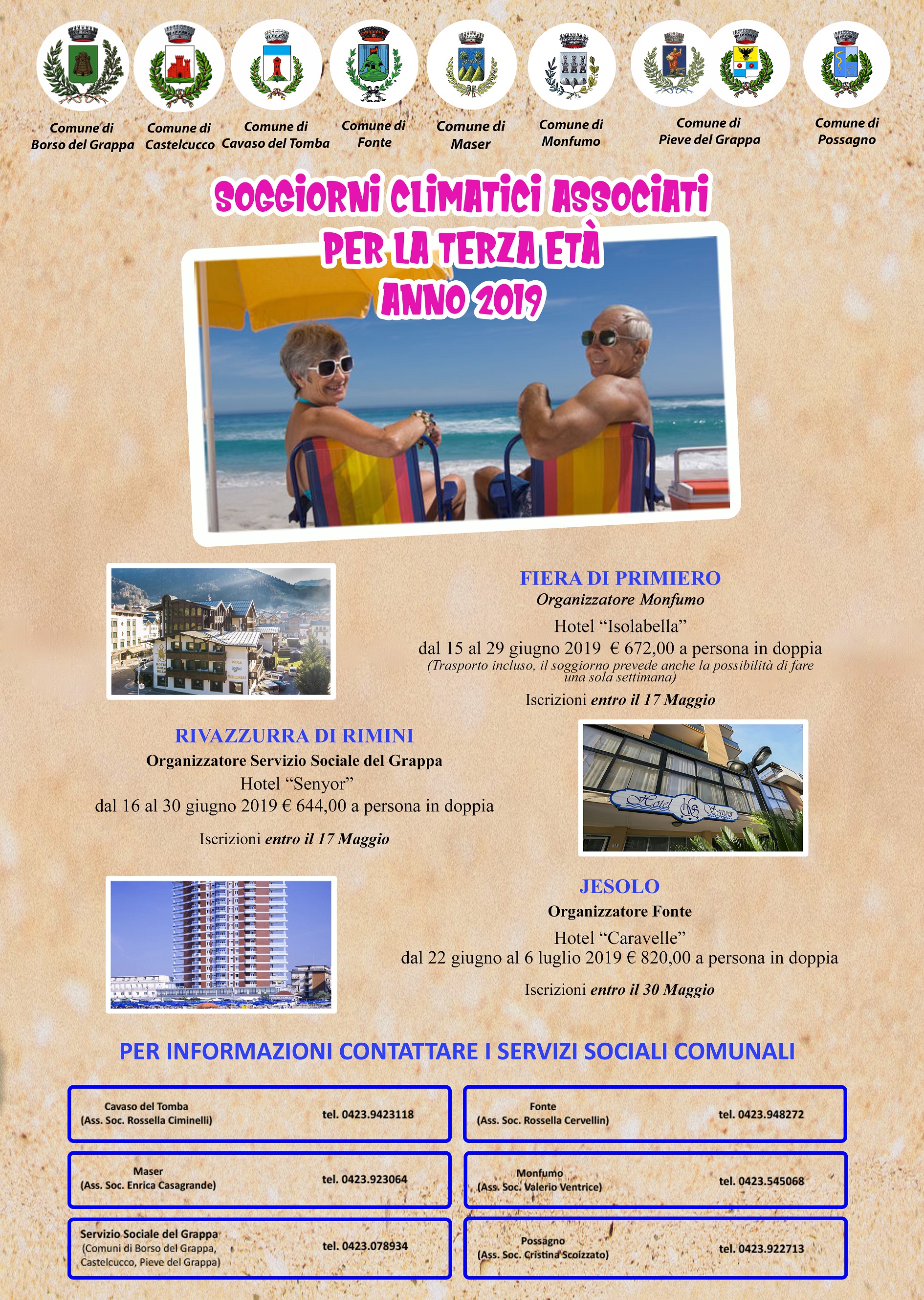 I Comuni di Cavaso del Tomba, Fonte, Maser, Monfumo, Possagno e del Servizio Sociale del Grappa (Borso del Grappa, Castelcucco e Pieve del Grappa) propongono a tutti i cittadini ultra sessantenni i soggiorni climatici. Per informazioni o iscrizioni rivolgersi presso l'Ufficio Servizi Sociali del Comune organizzatore.