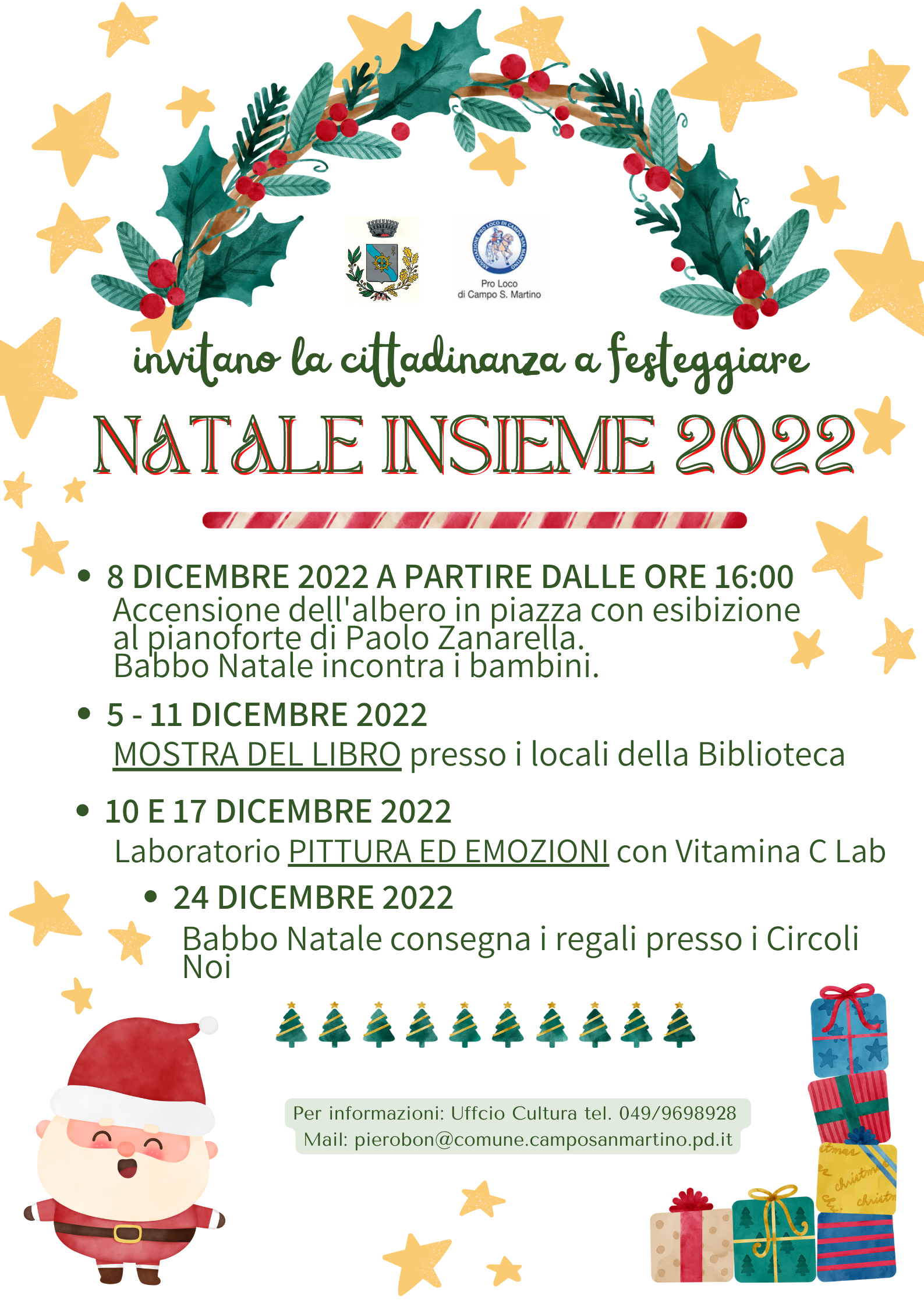- 8 DICEMBRE – pomeriggio (ore 16:00) accensione albero in piazza del Municipio con esibizione del pianista Zanarella. Babbo Natale incontra i bambini.