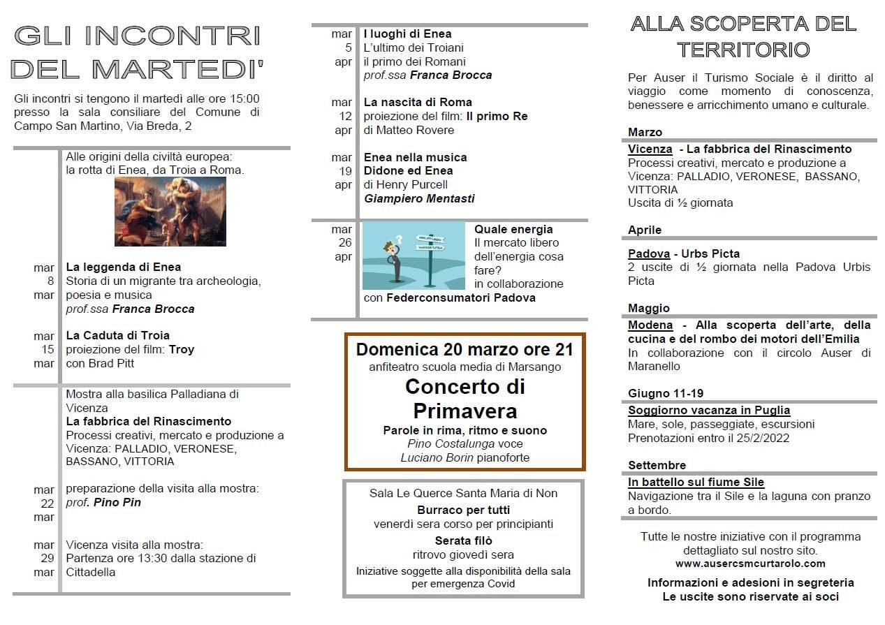 L'Associazione Auser, patrocinata dal comune di Campo San Martino, organizza, a partire dalI'8 marzo 2022 ore 15:00, e a seguire ogni martedì, presso la Sala Consiliare del Comune un ciclo di conferenze intitolate "PADOVA URBS PICTA", con ingresso libero, in ottemperanza alla normativa vigente in materia di COVID-19.