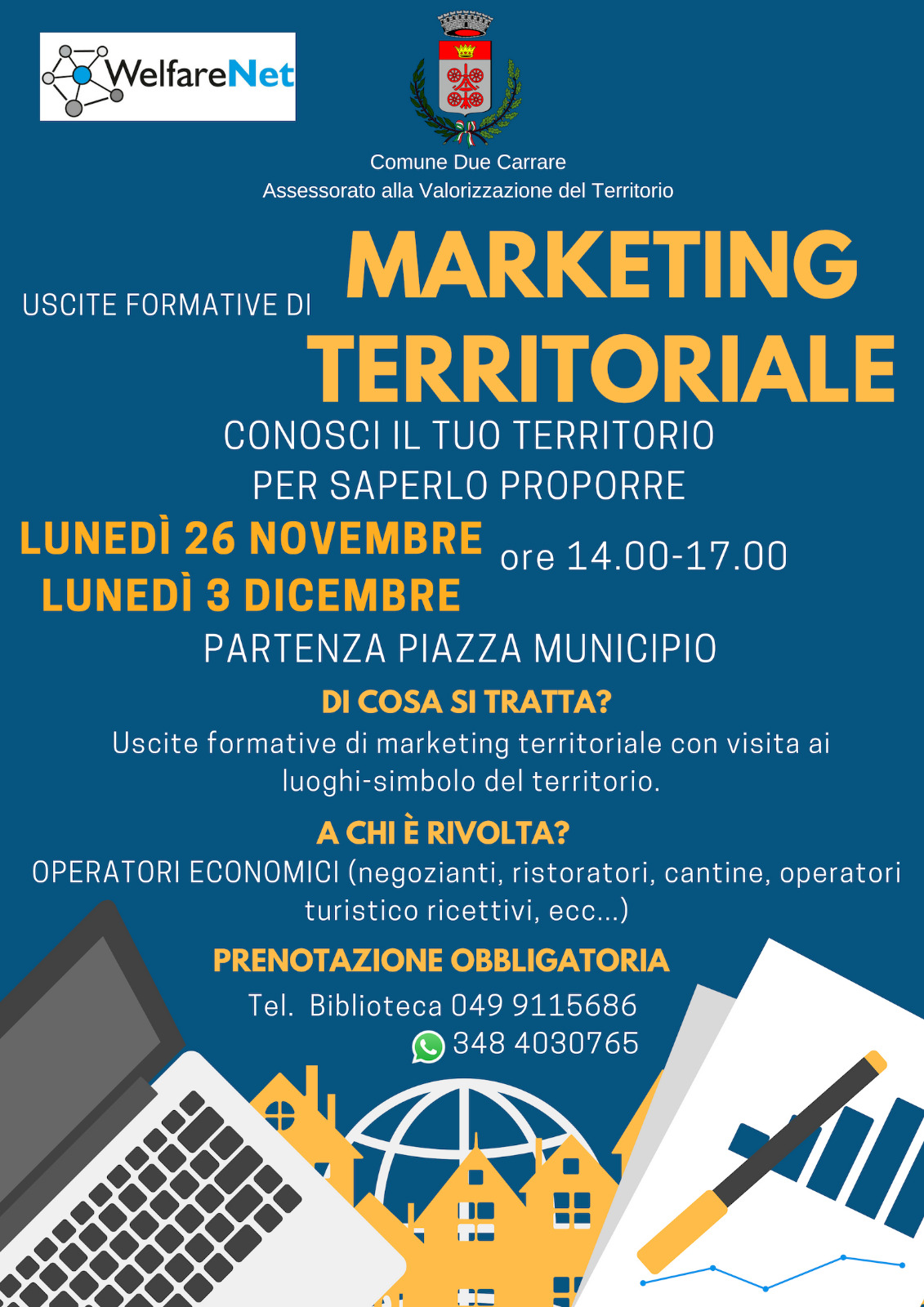 Proseguendo il percorso in collaborazione con WelfareNet e con l'Ente bilaterale Veneto - Friuli Venezia Giulia, già iniziato con il corso di web marketing, l'Amministrazione invita gli operatori economici del territorio a queste due uscite formative di marketing territoriale, per conoscere il nostro territorio e saperlo proporre e promuovere.