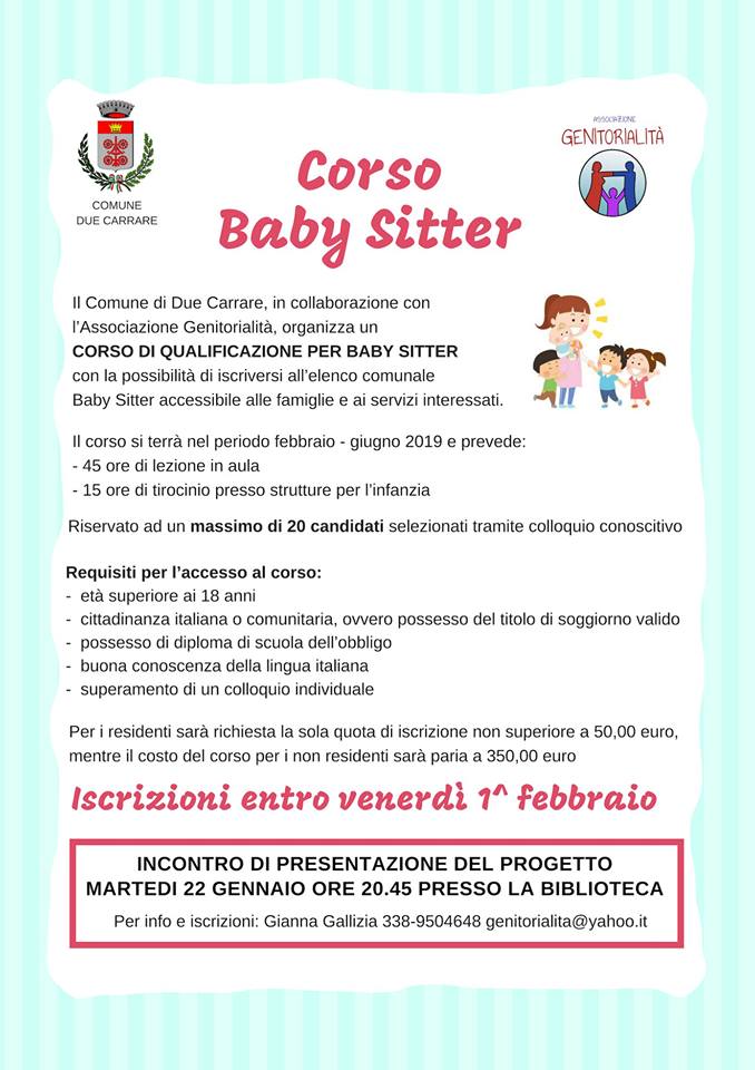 Sono aperte le iscrizioni al corso di formazione per baby sitter promosso dall'Amministrazione Comunale in collaborazione con l'Associazione Genitorialità: una bella occasione per accrescere le proprie competenze relazionali con i bambini e creare un'opportunità professionale.