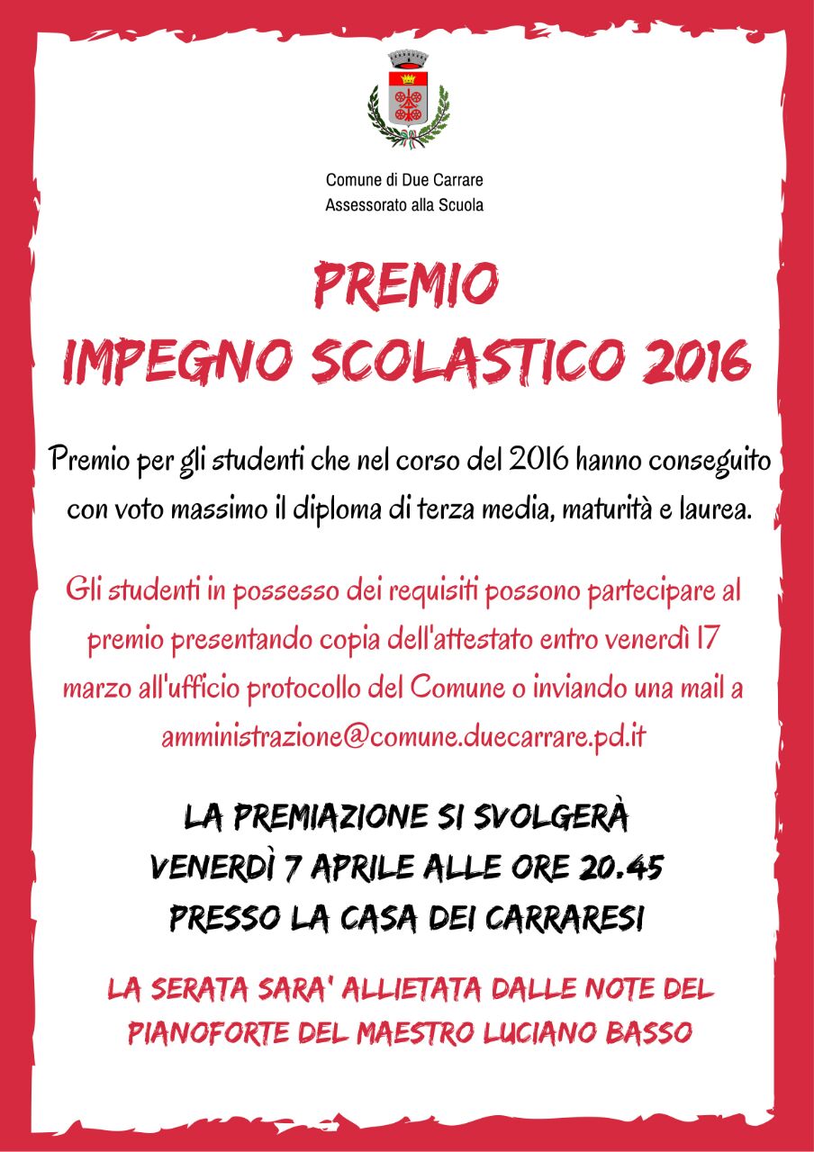 Anche quest'anno, il Comune di Due Carrare è orgoglioso di premiare gli studenti carraresi che, nell'anno 2015/16, hanno concluso a pieni voti un ciclo di studi, conseguendo 10/10 nell'esame di terza media, o 100/100 in quello di maturità, o 110/110 in quello di laurea.