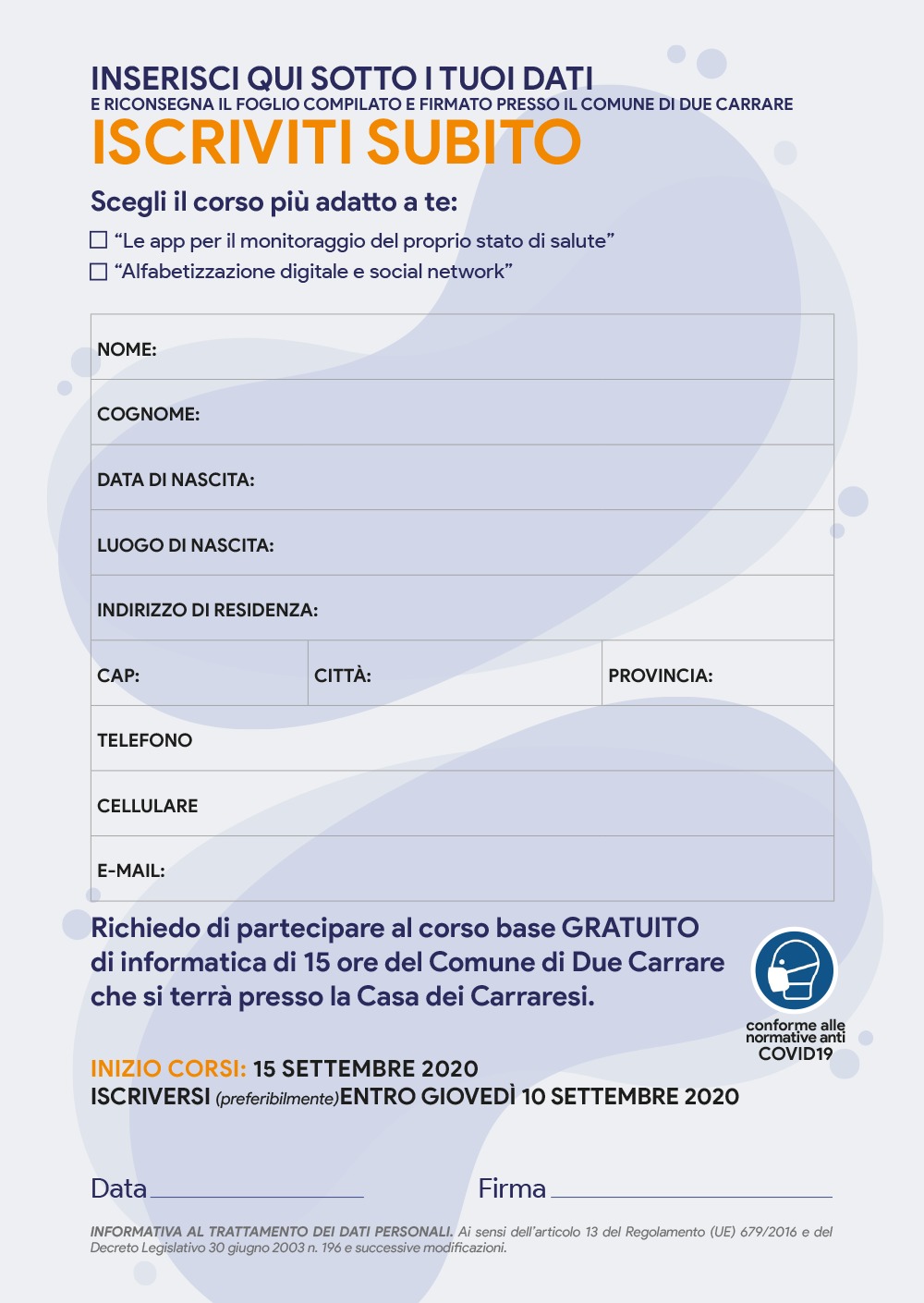 Sono previste 15 ore di corso con inizio il giorno 15 settembre presso la Casa dei Carraresi dalle ore 16.00 alle ore 18.00.