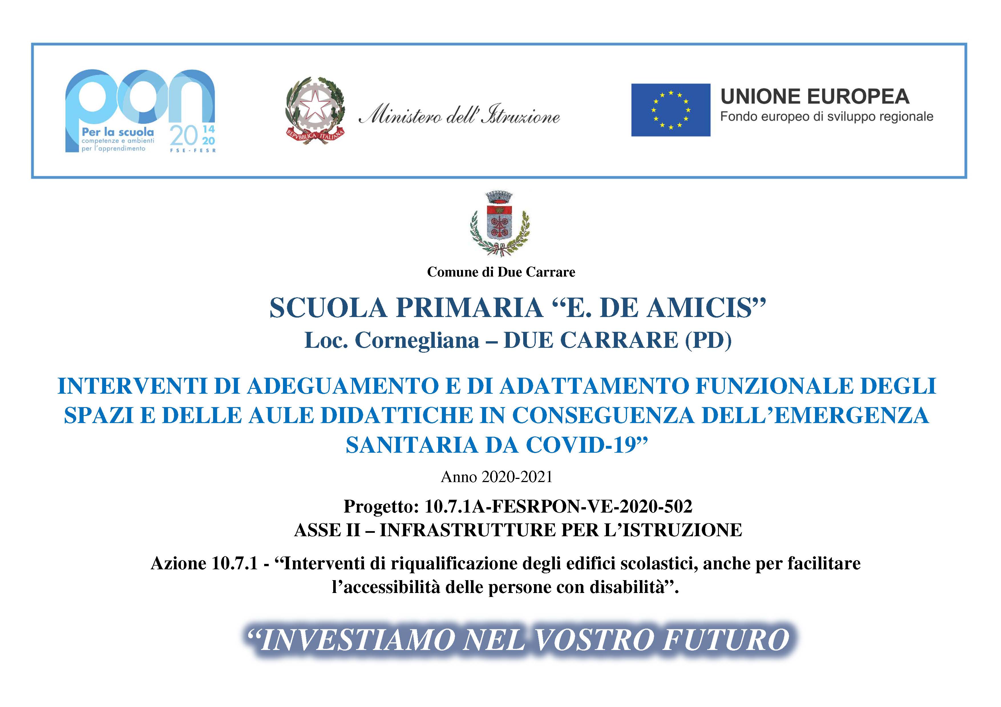 Il Ministero dell’Istruzione – Dipartimento per il sistema educativo e di istruzione e di formazione ha pubblicato l’Avviso n. 0013194 in data 24 giugno 2020 dal titolo “Interventi di adeguamento e di adattamento funzionale degli spazi e delle aule didattiche in conseguenza dell’emergenza sanitaria da COVID-19”. Con nota di autorizzazione protocollo n. AOODGEFID/20822 datata 13.07.2020 del Ministero dell’Istruzione, il Comune di Due Carrare è risultato beneficiario del contributo di Euro 28.000,00 per l’esecuzione di “Interventi di adeguamento e di adattamento funzionale degli spazi e delle aule didattiche in conseguenza dell’emergenza sanitaria da Covid-19” finanziato con Fondi Strutturali Europei – Programma Operativo Nazionale “Per la scuola, competenze e ambienti per l’apprendimento” 2014-2020 – Asse II – Infrastrutture per l’istruzione - Fondo Europeo di Sviluppo Regionale (FESR) – Obiettivo specifico 10.7 – Azione 10.7.1.