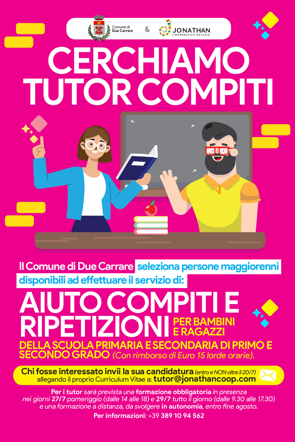 Il Comune di Due Carrare seleziona persone maggiorenni disponibili ad effettuare il servizio di AIUTO COMPITI E RIPETIZIONI per bambini e ragazzi della scuola primaria e secondaria di primo e secondo grado.