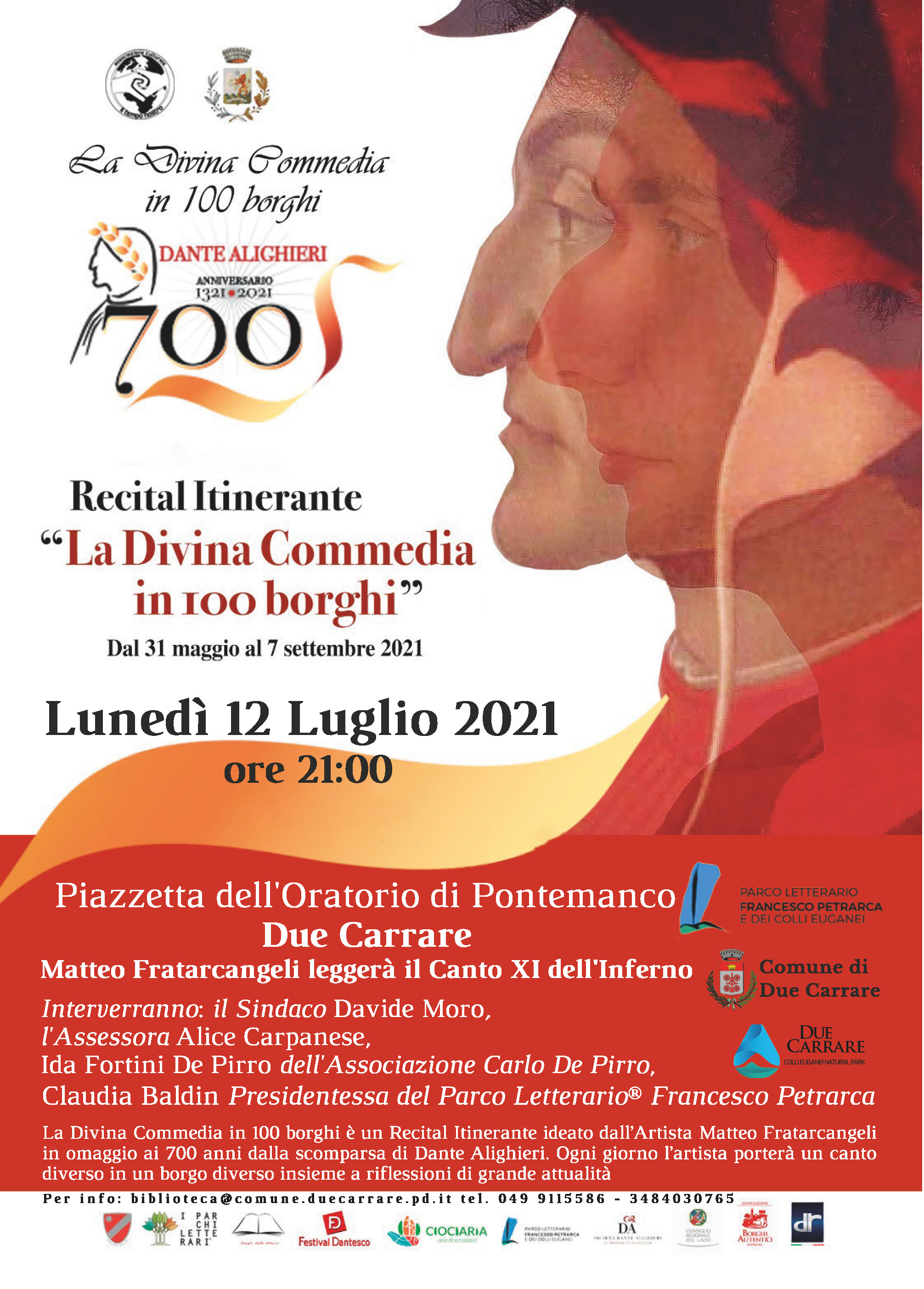 Lunedì 12 Luglio alle ore 21:00 il performer Matteo Fratarcangeli animerà la piazzetta di PONTEMANCO con il recital dell'XI Canto dell'Inferno. Il progetto http://www.ladivinacommediain100borghi.it/ nasce per portare la Divina Commedia in 100 borghi d'Italia in omaggio ai 700 anni dalla scomparsa di Dante. Ogni giorno, l’artista, porta un canto in ogni borgo e ogni tappa è l'occasione di riflessione esistenziale verso il concepimento di alcuni grandi temi cari a Dante ma sottotono ai giorni nostri
