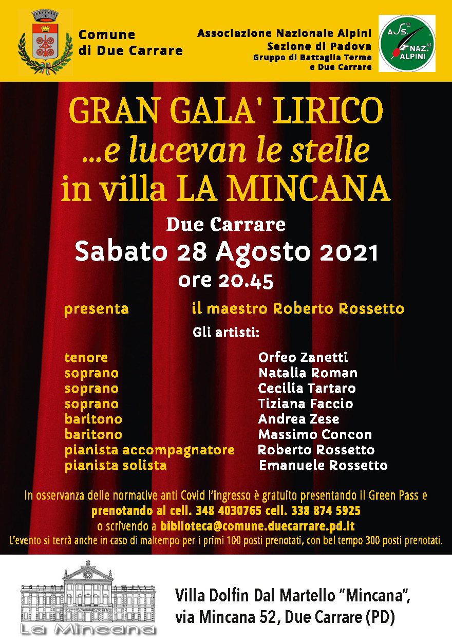 Il Comune di Due Carrare in collaborazione con l’Associazione Nazionale Alpini Gruppo di Battaglia Terme e Due Carrare vi invitano al tradizionale Galà della lirica SABATO 28 AGOSTO 2021, alle ore 20.45 presso villa La Mincana Dal Martello a Due Carrare.