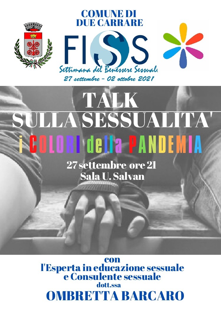 Lunedì 27 Settembre ore 21:00 presso la sala "U. Salvan" in Casa dei Carraresi si terrà un TALK sulla SESSUALITA' con la dottoressa Ombretta Barcaro, esperta in educazione sessuale e Consultente sessuale. L'incontro è rivolto a giovani e adulti in occasione della Settimana del Benessere sessuale indetta dalla Federazione Italiana di Sessuologia Scientifica dal 27 Settembre al 2 Ottobre 2021: "l’iniziativa sarà finalizzata alla divulgazione dei temi riguardanti la salute salute sessuale nei suoi legami con la salute individuale, di coppia, familiare e sociale, valorizzando gli interventi – scientificamente fondati – di educazione sessuale, di prevenzione dei problemi legati alla sessualità e di cura precoce dei disturbi e disfunzioni sessuali in un’ottica integrata, rispettosa della loro realtà multidimensionale."