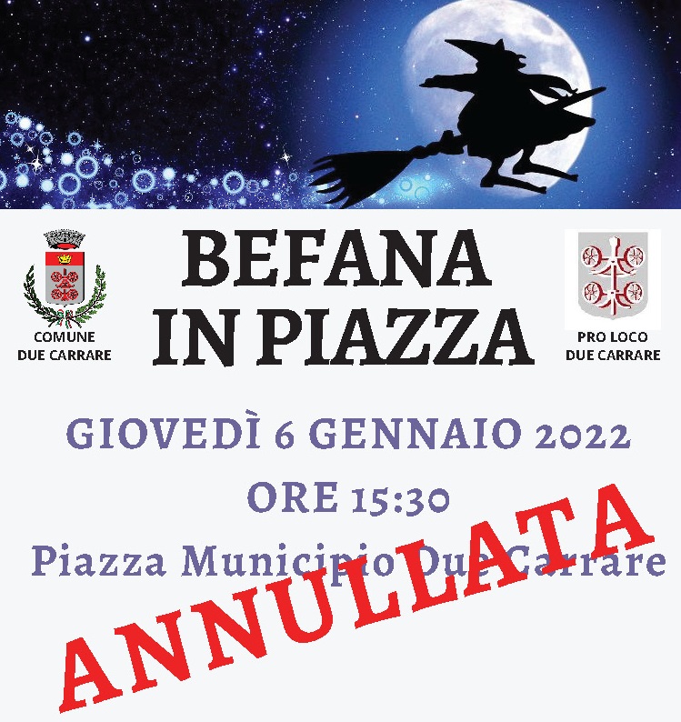 S’informa la cittadinanza che la manifestazione “Befana in piazza”, in programma per il giorno 6 gennaio 2022, a seguito dell’avvenuta pubblicazione del Decreto Covid Festività, del 24/12/2021 n. 221, è annullata.