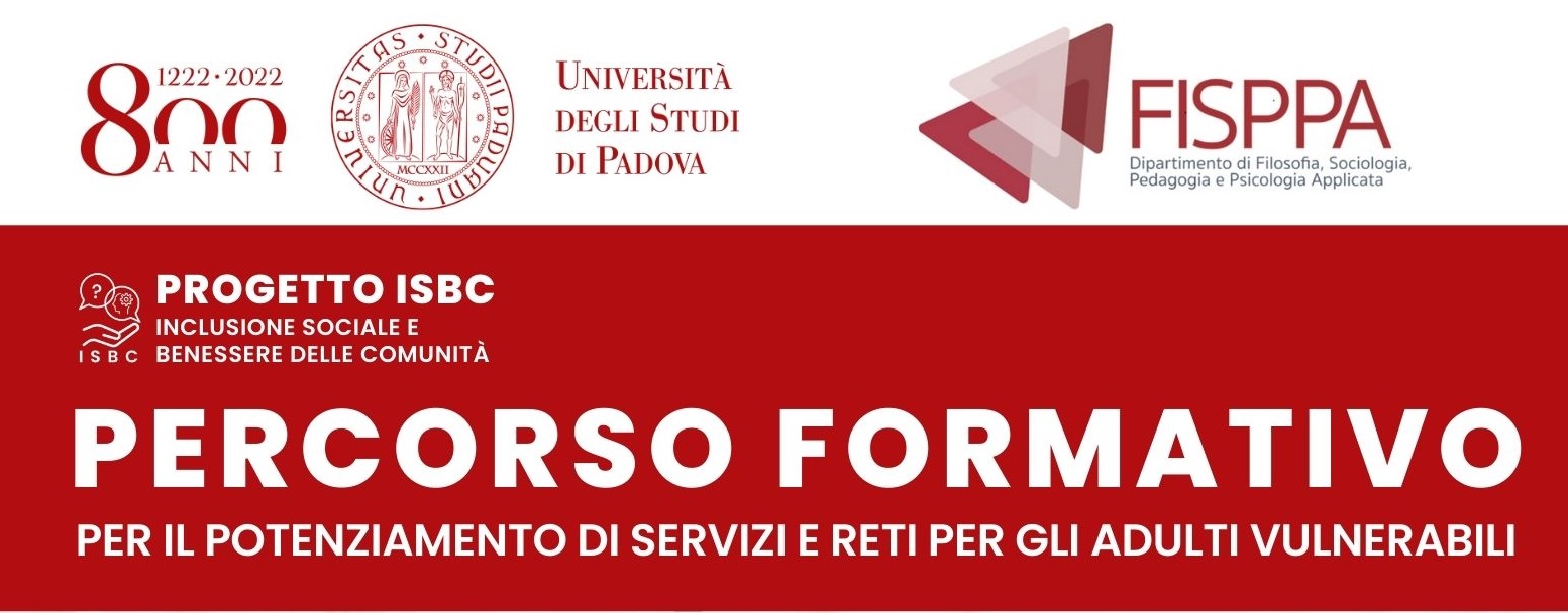 L'Amministrazione informa che sono aperte le iscrizioni per il percorso formativo ISBC - Inclusione Sociale e Benessere delle Comunità, finanziato dall’Università degli Studi di Padova e dal Dipartimento di Filosofia, Sociologia, Pedagogia e Psicologia Applicata (FISPPA) nell’ambito del Progetto di Terza Missione 2022 - Public Engagement (Responsabile scientifico: Prof.ssa Biasin Chiara).