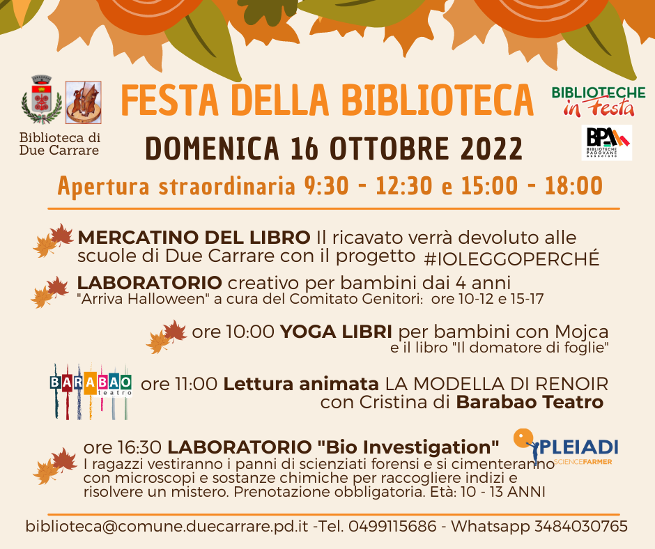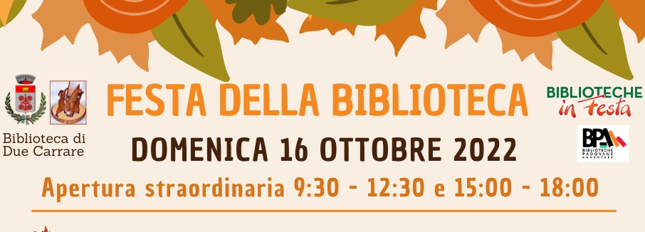 Nell'ambito della rassegna Biblioteche in Festa 2022 anche la Biblioteca di Due Carrare aderisce proponendo un'intera giornata di proposte e iniziative: