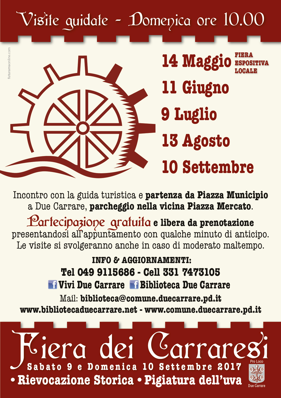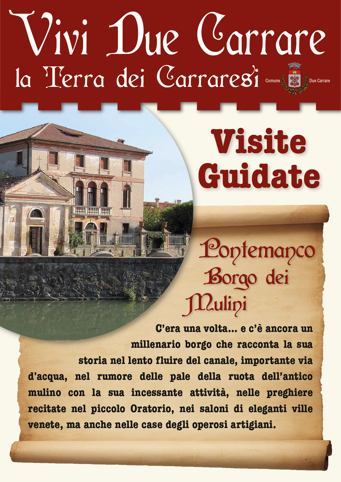 Ogni seconda domenica del mese, da aprile a settembre, partiremo per un viaggio attraverso il tempo e la Storia: andremo alla scoperta dei Carraresi, signori di Padova, e di ciò che rimane del loro castello; parleremo di D'Annunzio, il Vate che solcò il cielo di Vienna partendo dalla terra di Due Carrare; conosceremo meglio il borgo incantato di Pontemanco, avvicinandolo lungo il canale Biancolino che ancora spinge la ruota del mulino, dove un tempo si macinavano granaglie e ora si macina cultura. Questo mese l'appuntamento è domenica 11 giugno, alle dieci davanti al Municipio: non occorre prenotare, basta presentarsi qualche minuto prima della partenza (con scarpe comode per passeggiare!). La visita si terrà anche in caso di (leggero) maltempo e finirà circa alle 12.00.