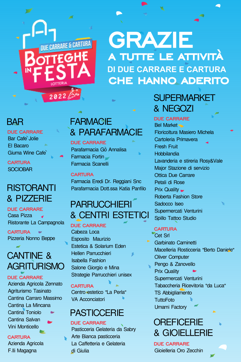 Il Comune di Due Carrare ed il Comune di Cartura, in collaborazione con le Pro Loco di Due Carrare e Cartura con il patrocinio della Camera di Commercio di Padova, dell’ASCOM, CONFESERCENTI di Padova, PARROCCHIE dei due Comuni, Ente Bilaterale, al fine di incentivare gli acquisti presso i negozi di vicinato, supermercati, cantine, Pubblici Esercizi presenti nel territorio di Due Carrare, durante il periodo natalizio per l’anno 2022, propone l’iniziativa della lotteria con il logo “Botteghe in Festa”.