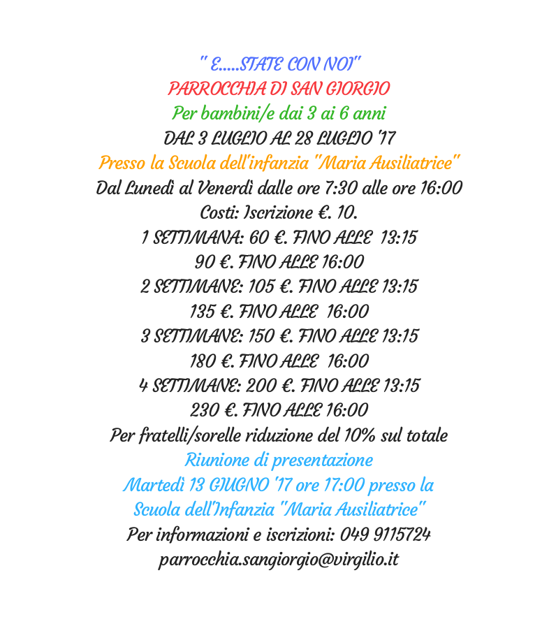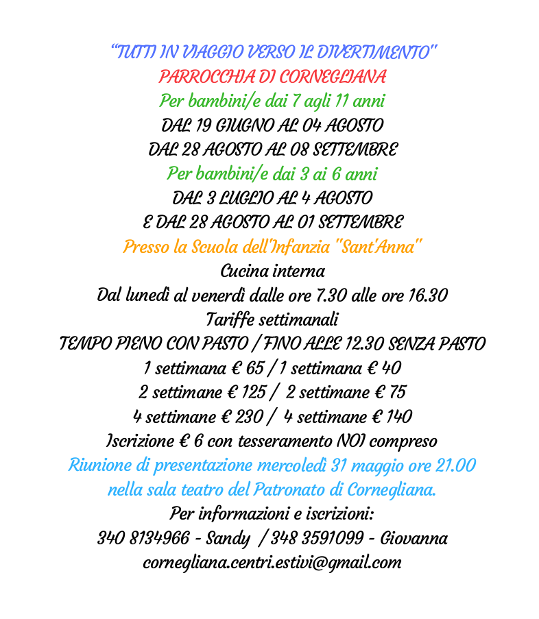 Fiduciosi che la varietà e pluralità delle offerte possa offrire una risposta adeguata ai bisogni delle nostre famiglie, auguriamo a tutti un'estate densa di esperienze positive e di coinvolgenti attività!